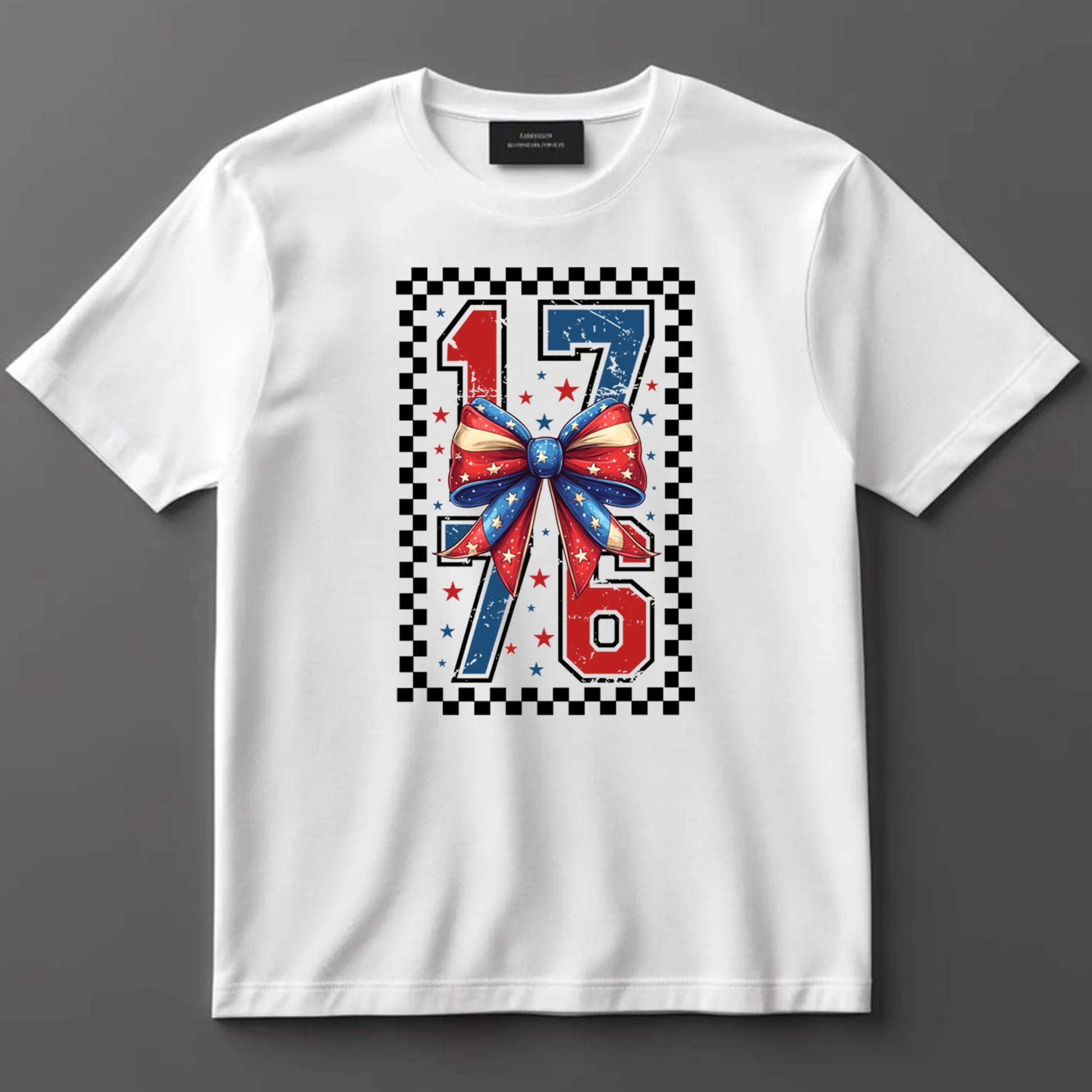 Product Description: Vintage 1776 DTF transfer with a patriotic red, white, and blue bow, surrounded by a black checkered border and scattered stars.