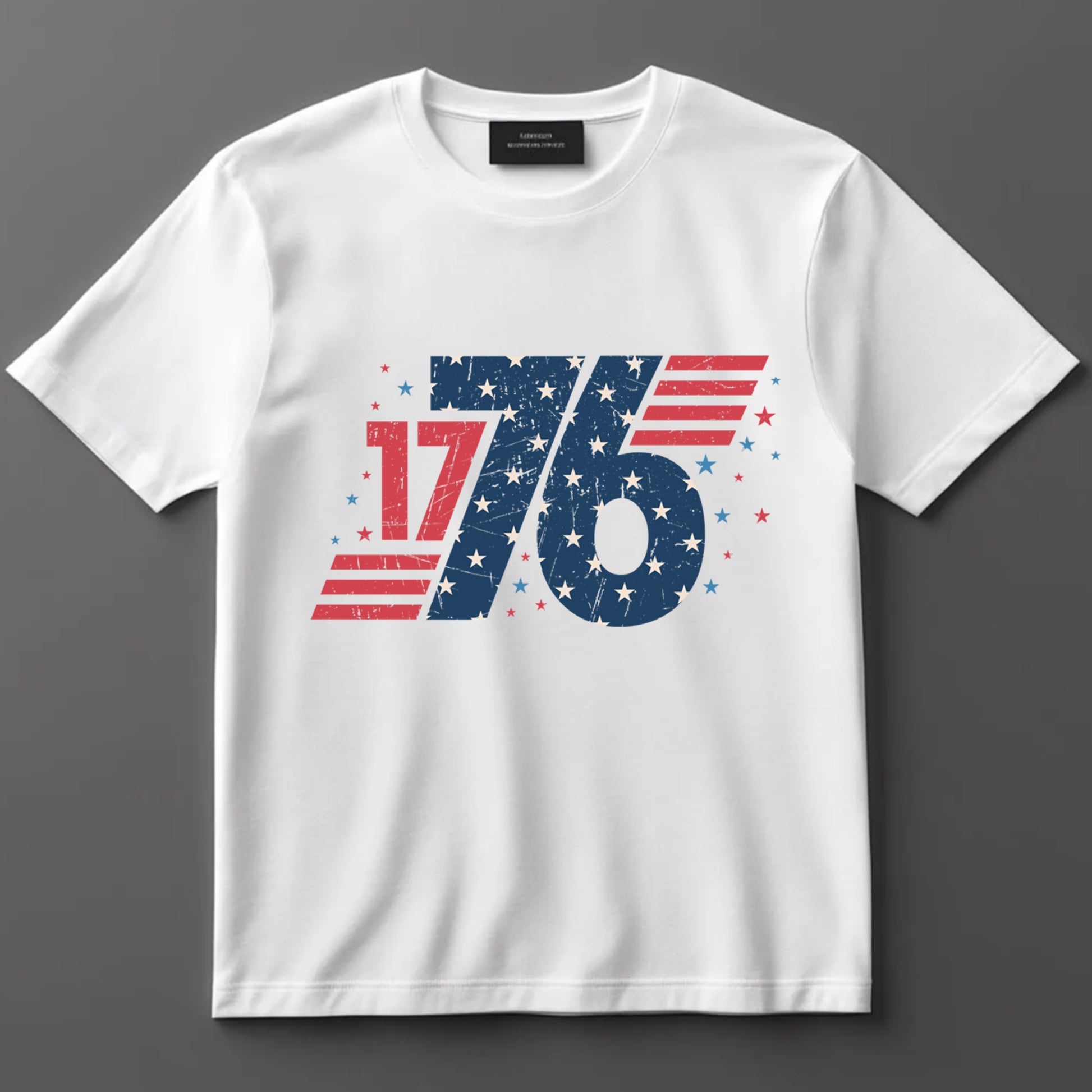Product Description: Features bold 1776 numbers with distressed textures, red stripes, and white stars on blue. A patriotic staple for any Fourth of July shirt.
