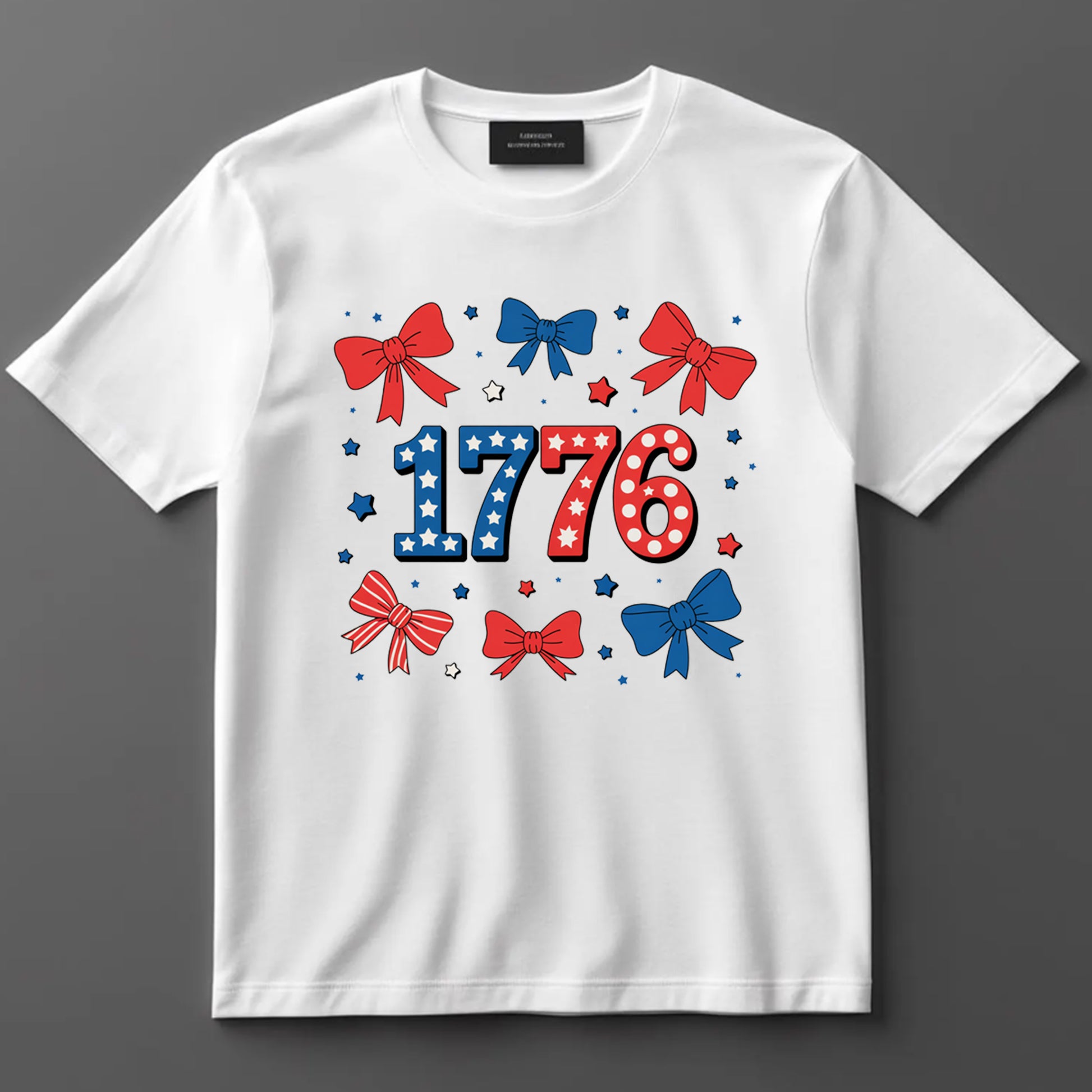 Product Description: Celebrate Independence Day with this fun 1776 DTF transfer featuring patriotic red and blue bows and stars. Perfect for festive kids' and adult tees.
