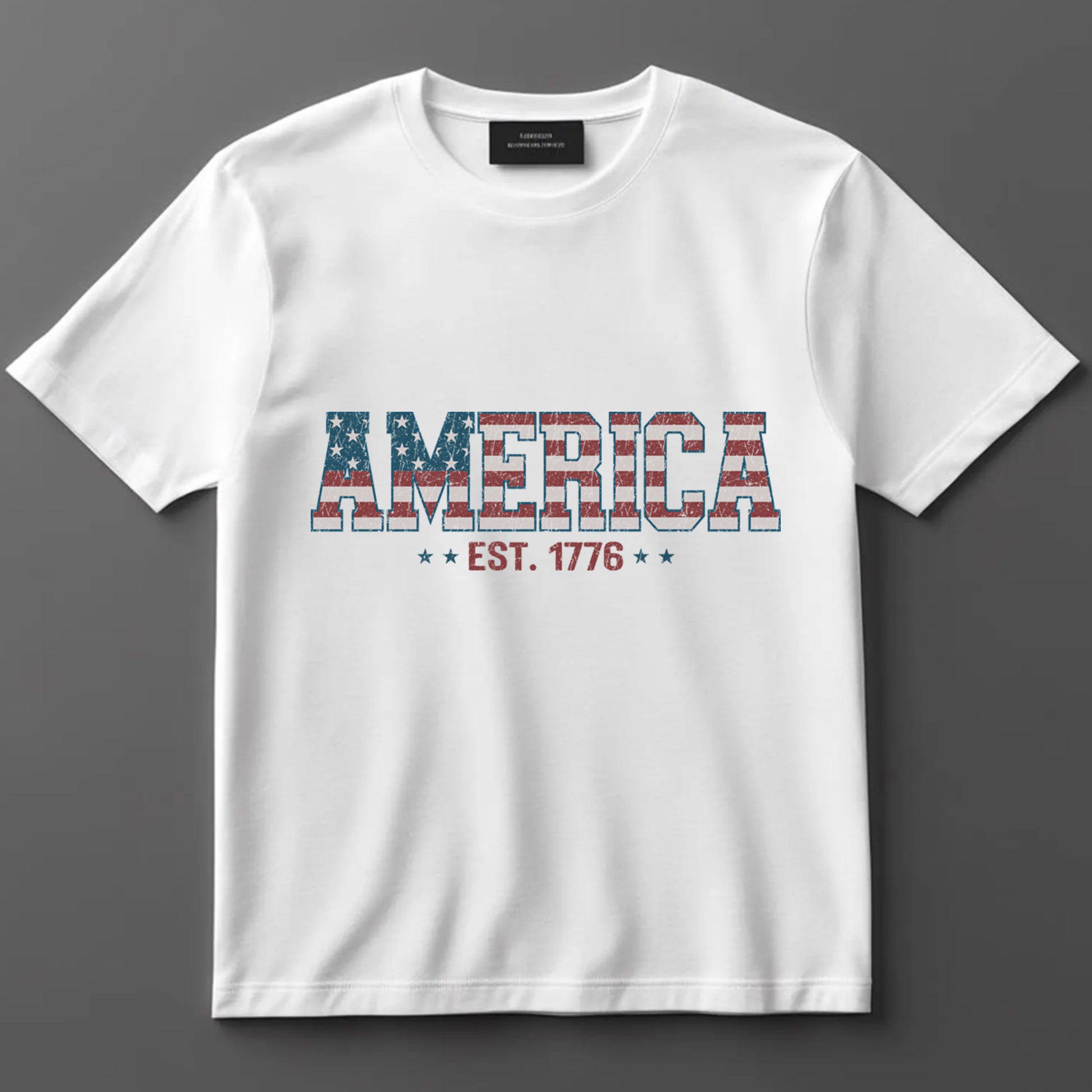 Product Description: Celebrate American heritage with this ready to press DTF transfer featuring the word AMERICA filled with stars and stripes, and the phrase Est. 1776. A classic patriotic print perfect for 4th of July T-shirts or sweatshirts.