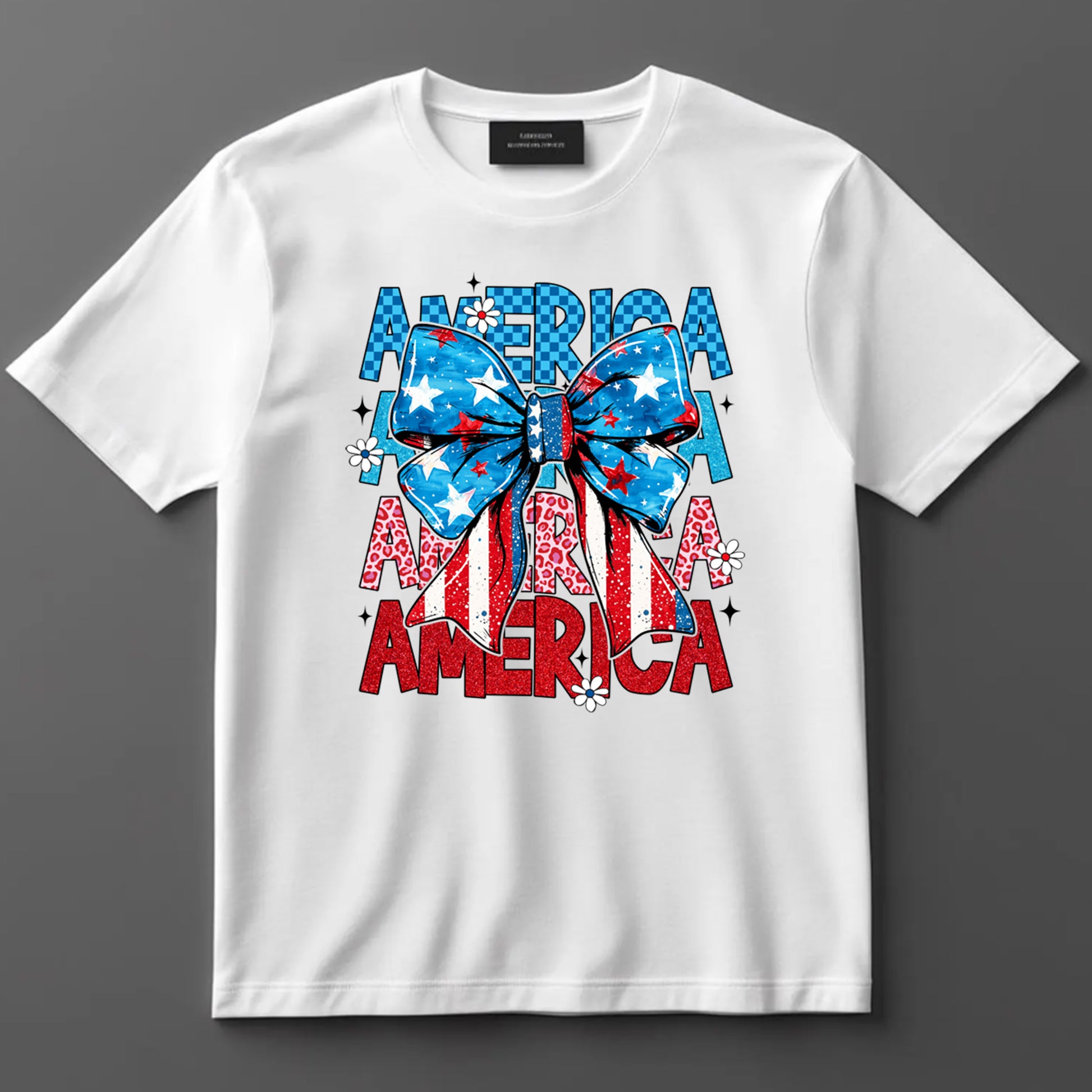 Product Description: Stacked "America" lettering with checkered, leopard, and glitter patterns behind a large patriotic bow. Ideal for festive and fun 4th of July apparel.