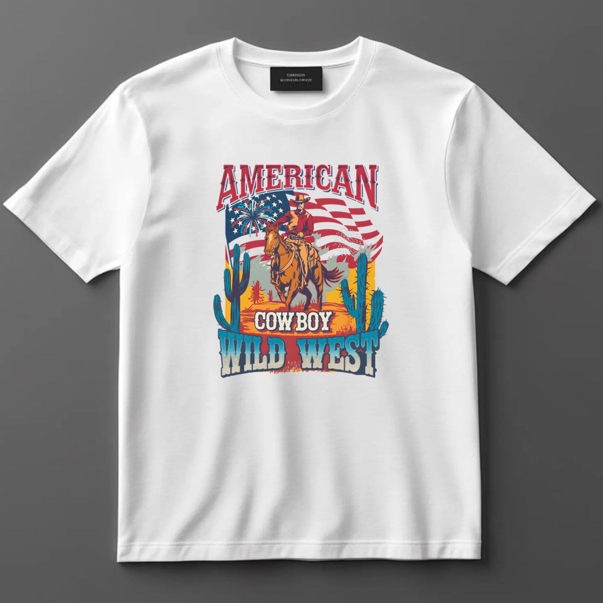 Product Description: Bring Western pride to life with this American Cowboy Wild West DTF transfer. Featuring a rider on horseback with fireworks, cacti, and an American flag backdrop, it’s perfect for patriotic country-themed apparel.