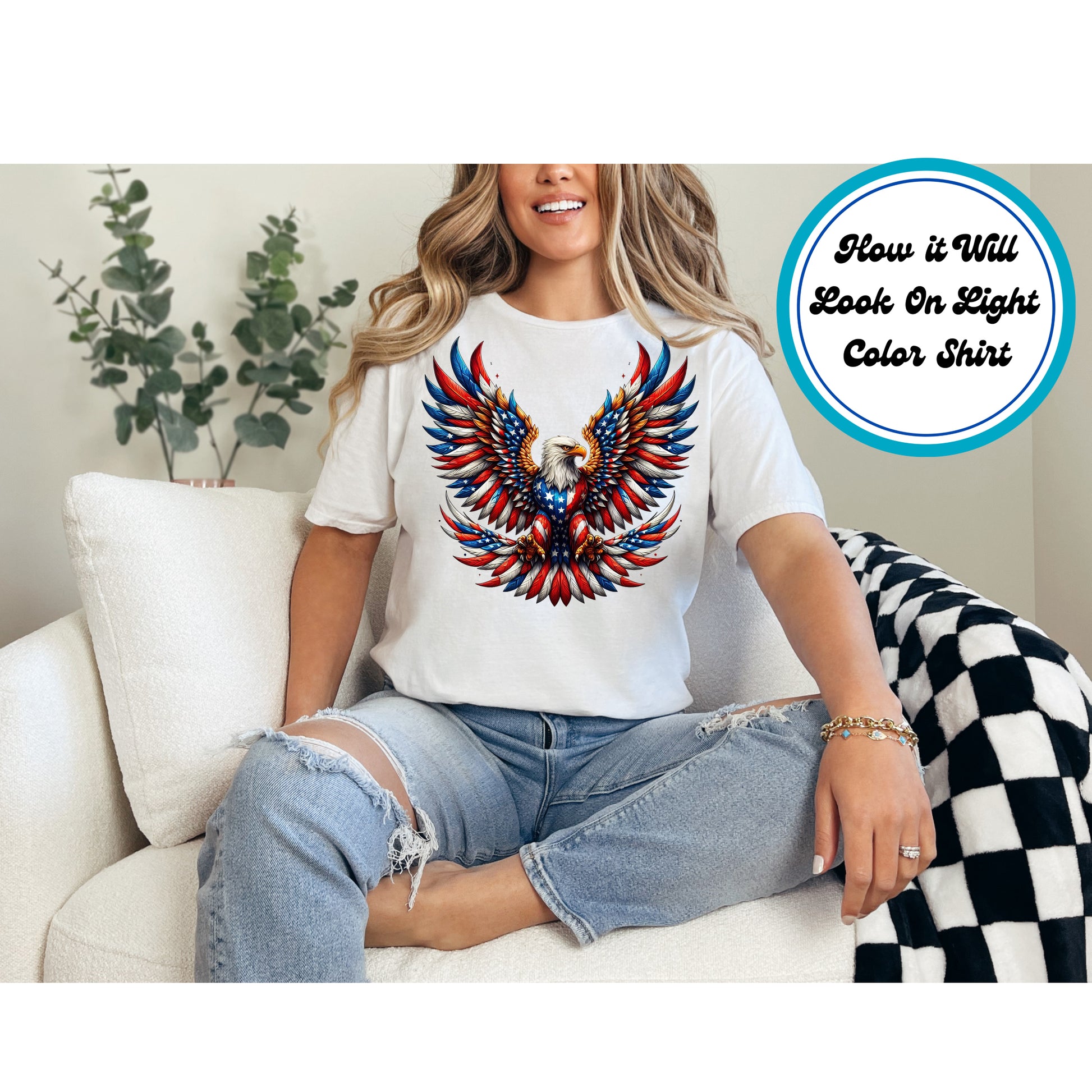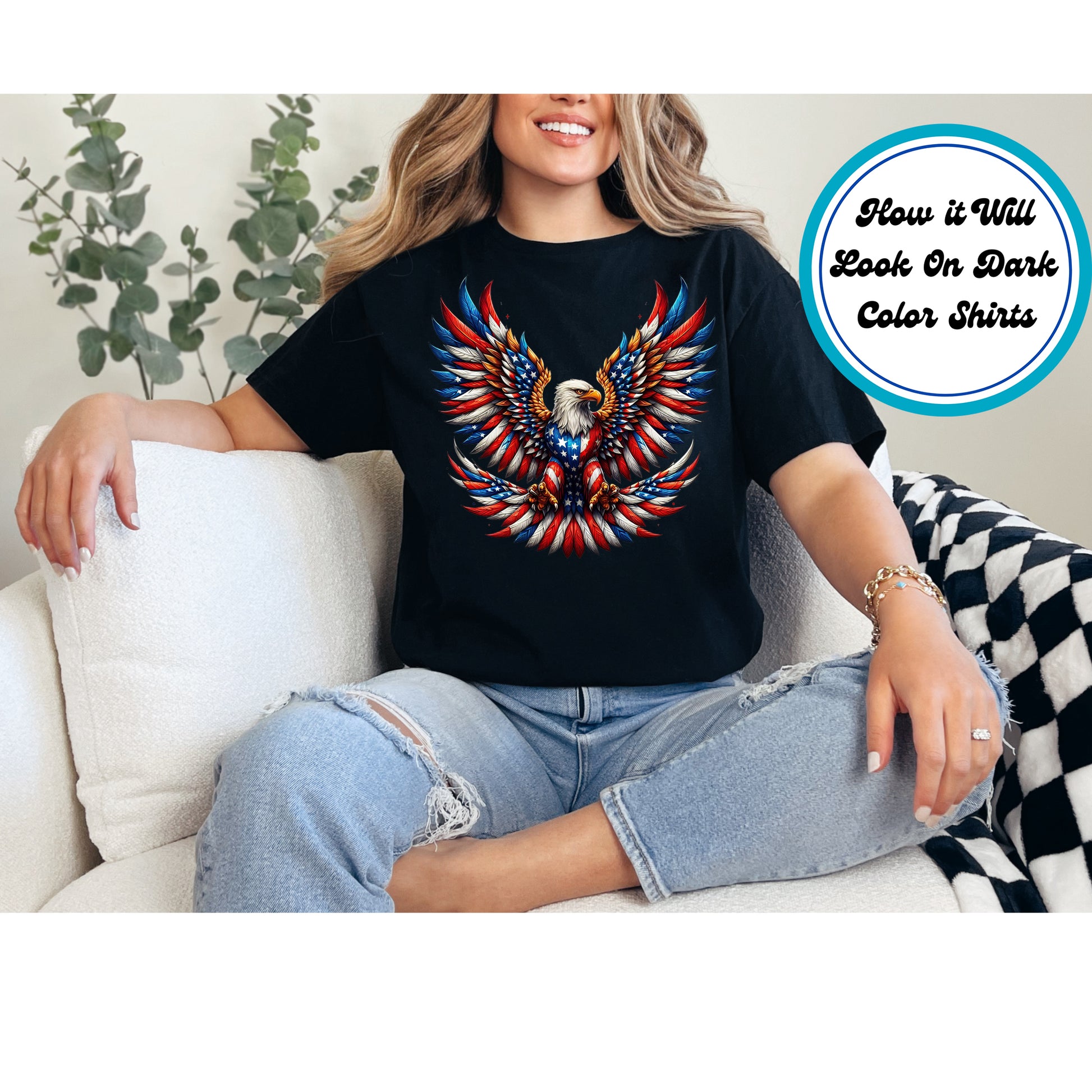Product Description: This DTF transfer features a powerful bald eagle with wings spread wide in red, white, and blue, making it ideal for patriotic apparel and 4th of July celebrations.