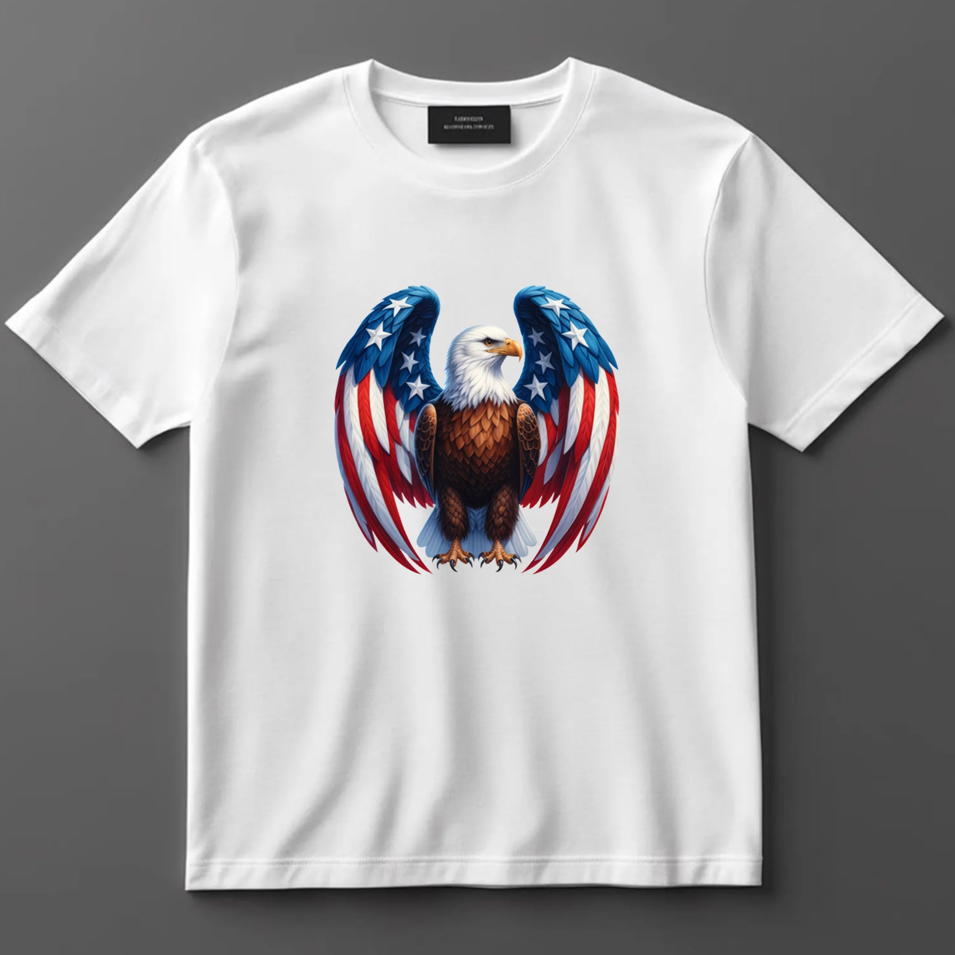 Product Description: This bold DTF transfer features a proud bald eagle with wings styled in red, white, and blue feathers with white stars. Perfect for celebrating the 4th of July, this ready to press print is ideal for patriotic T-shirts or sweatshirts.