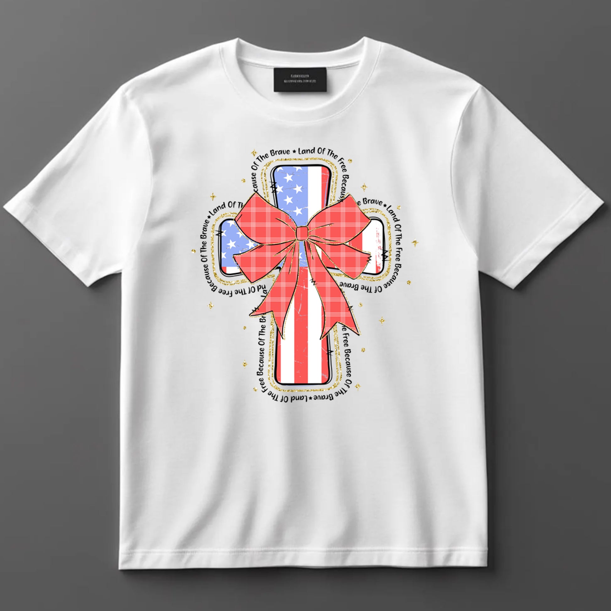 Product Description: Celebrate faith and freedom with this patriotic DTF transfer featuring a distressed American flag cross wrapped in a red plaid bow. Surrounded by the phrase “Land of the Free Because of the Brave,” it's a perfect statement piece for Memorial Day, July 4th, or Veteran support shirts.