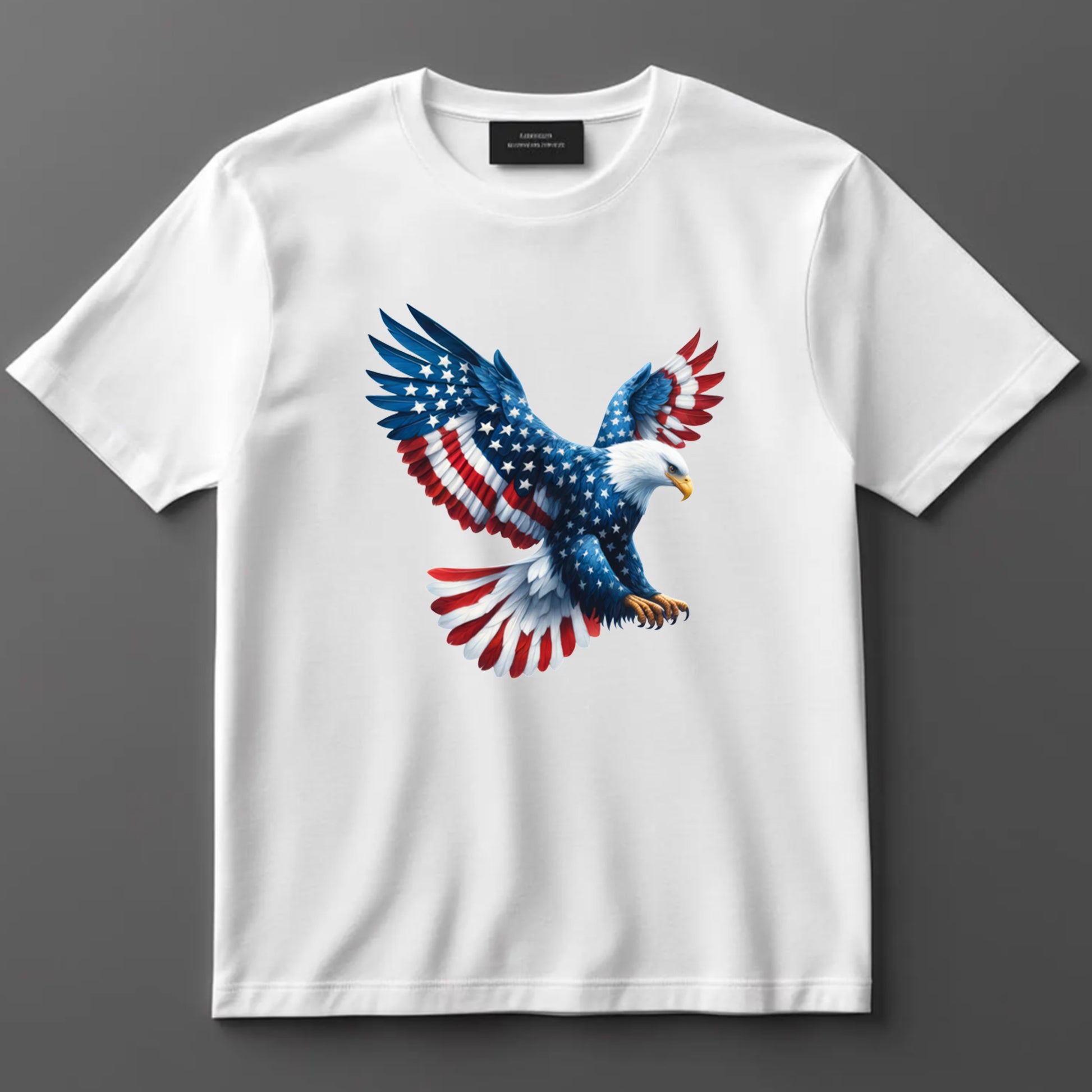 Product Description: This vibrant DTF transfer features a bald eagle soaring mid-air with wings and body completely draped in stars and stripes. A bold symbol of American pride, perfect for Independence Day apparel. Ready to press on shirts and sweatshirts.