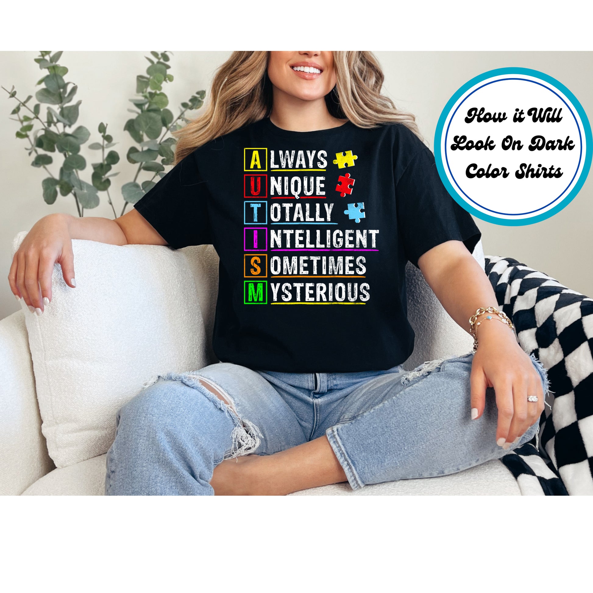 Product Description: This DTF transfer spells out AUTISM in a colorful acronym: Always Unique Totally Intelligent Sometimes Mysterious. Each letter features bold colors with puzzle piece accents, making it a standout awareness piece for shirts, totes, or teacher gear. Ready to press.