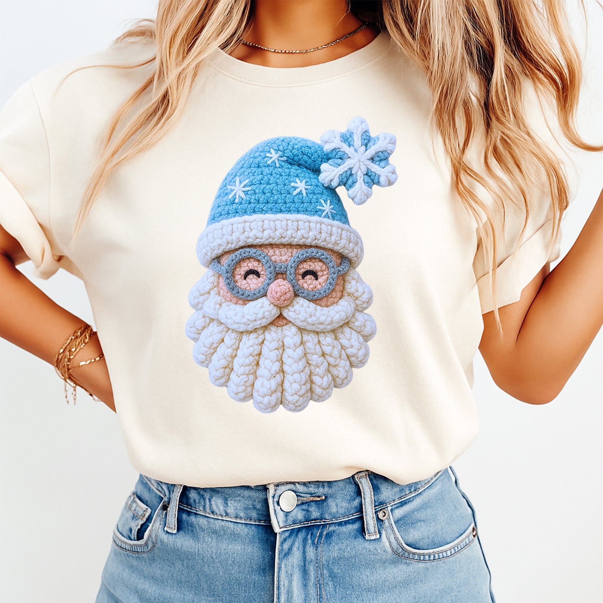 This ready to press Christmas DTF transfer features a handcrafted yarn-crochet Santa with a fluffy stitched beard, round glasses, a cozy blue winter hat, and a snowflake pom-pom detail. The soft textured look and cool-tone holiday colors make it perfect for winter apparel, festive events, and Christmas sellers looking for unique seasonal prints.