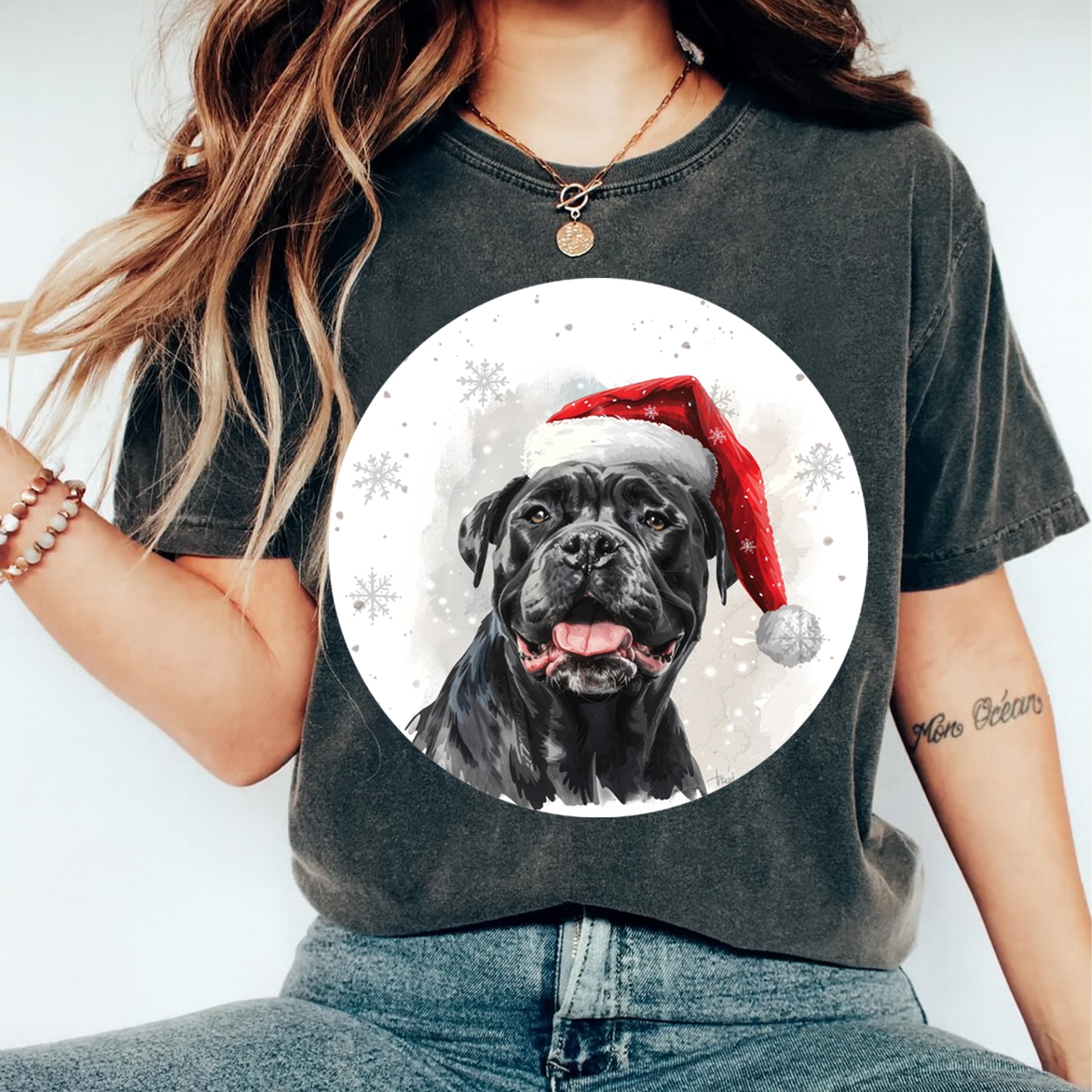 This ready to press Christmas DTF transfer features a Cane Corso wearing a Santa hat inside a round snowflake portrait, creating a bold and festive winter look. The strong expression and snowy background make it perfect for pet lovers, holiday markets, winter pop-ups, and seasonal DIY shirt collections for small businesses.