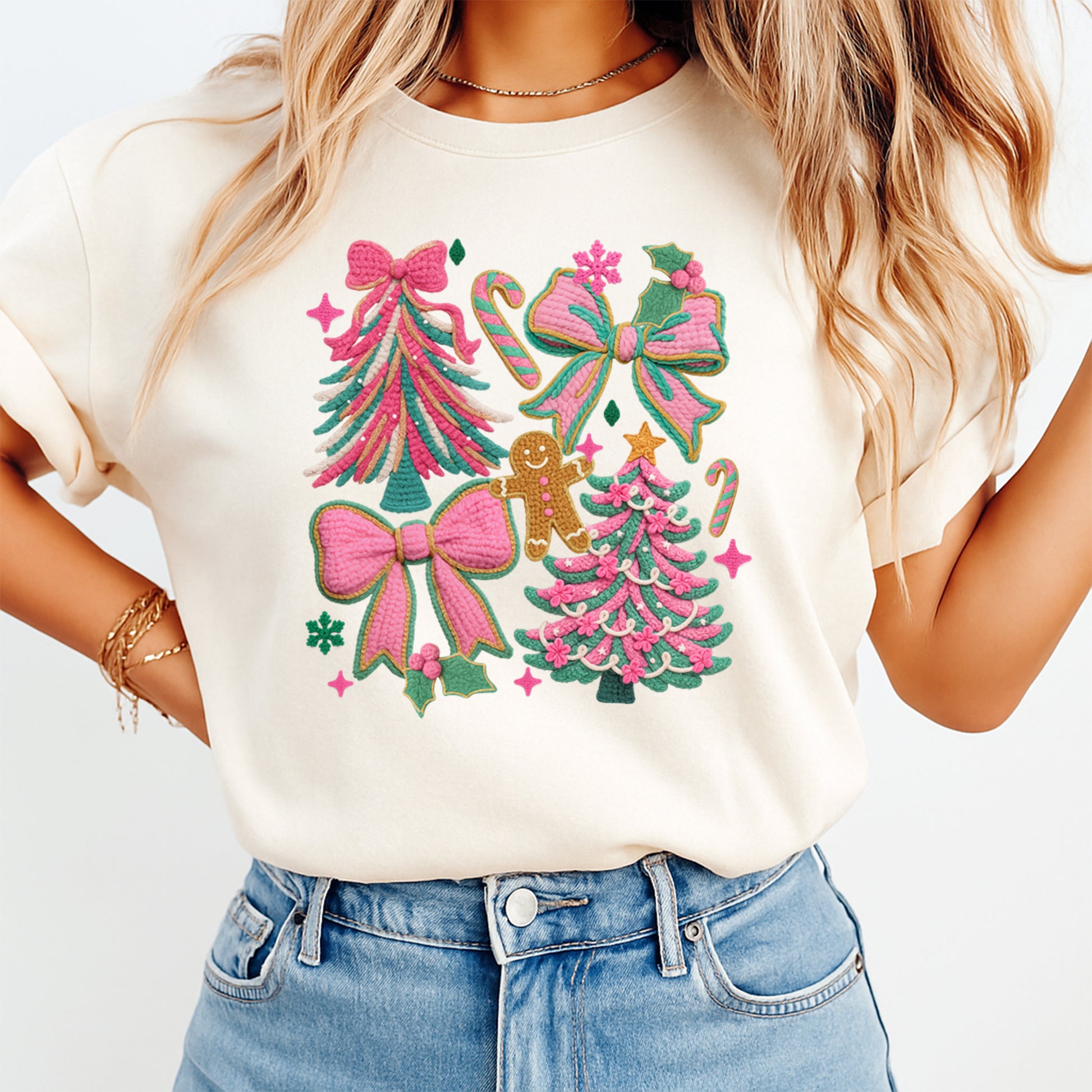 This ready to press Christmas DTF transfer features pastel yarn-crochet holiday elements including pink bows, stitched Christmas trees, a gingerbread character, candy canes, and festive stars.