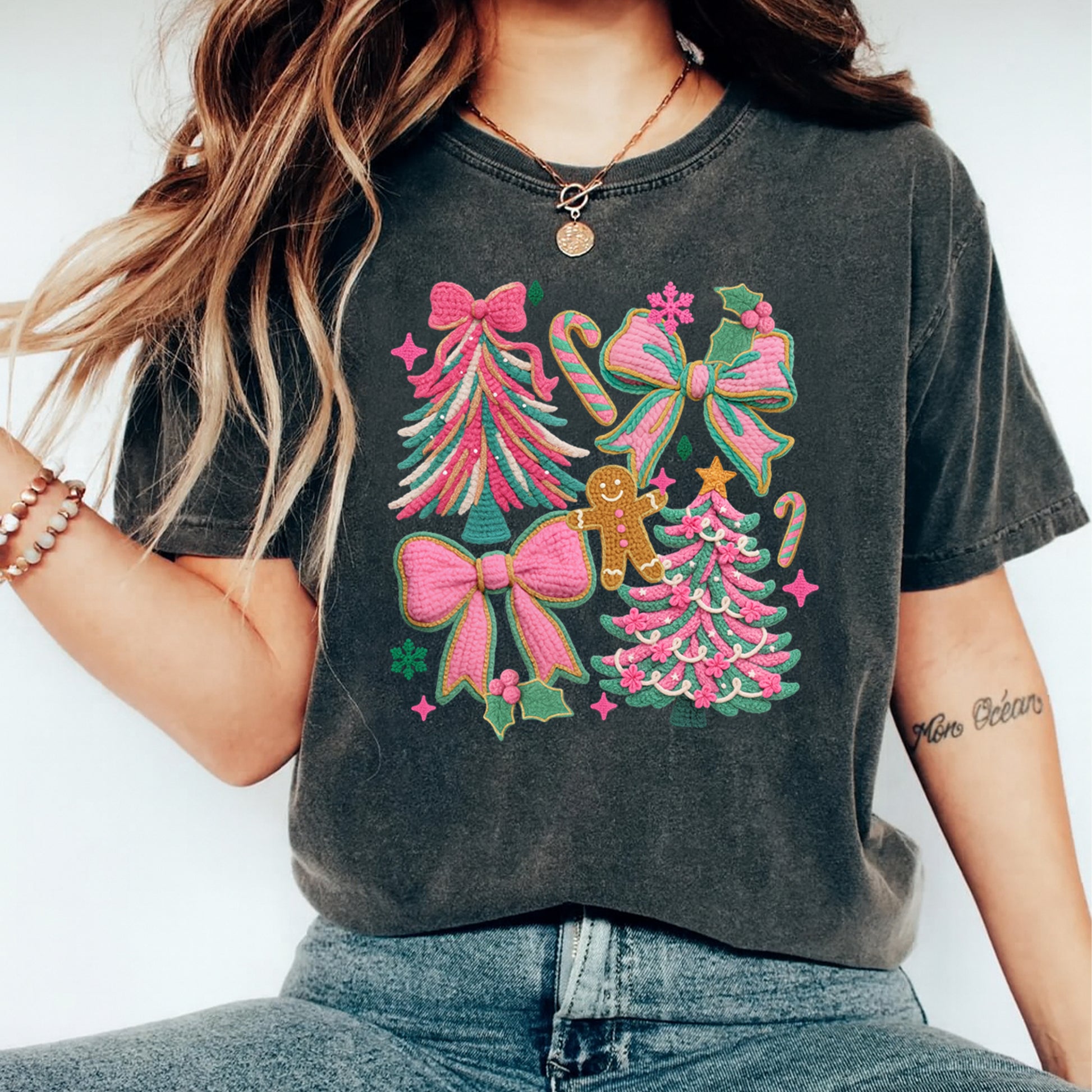Christmas Yarn Crochet Pink Bows and Trees DTF Transfer – Ready to Press Iron On Heat Transfer for DIY Christmas Shirts 12279