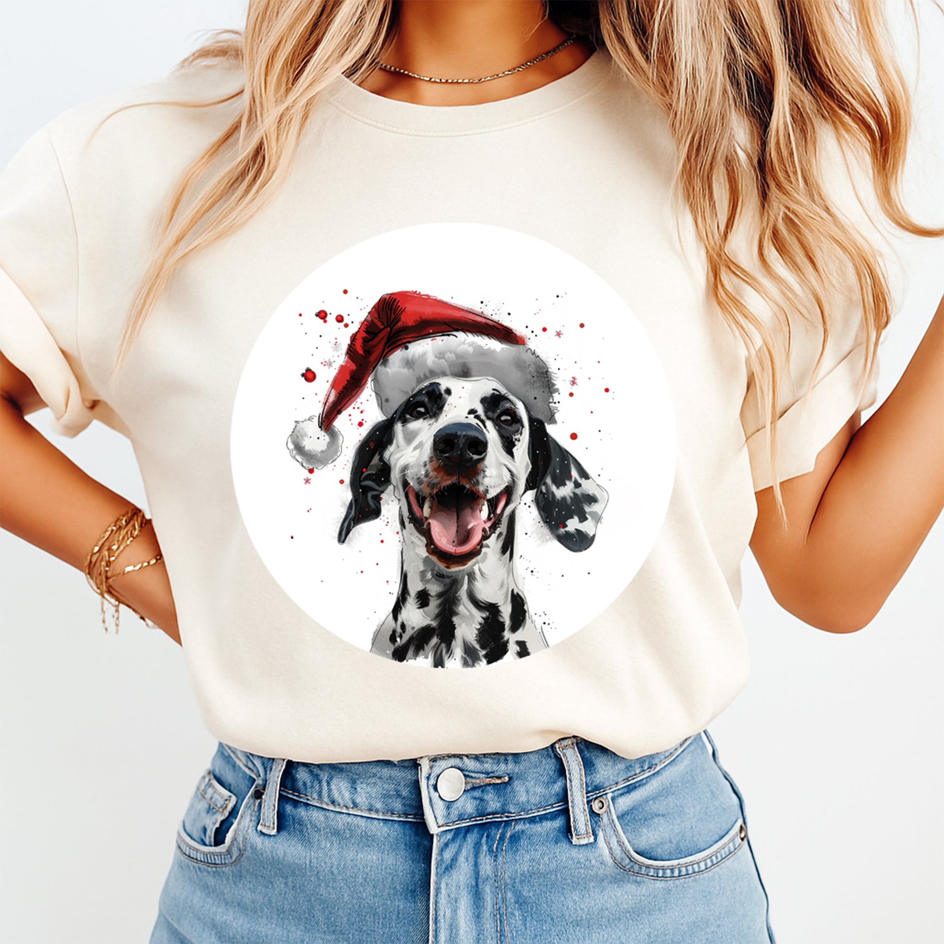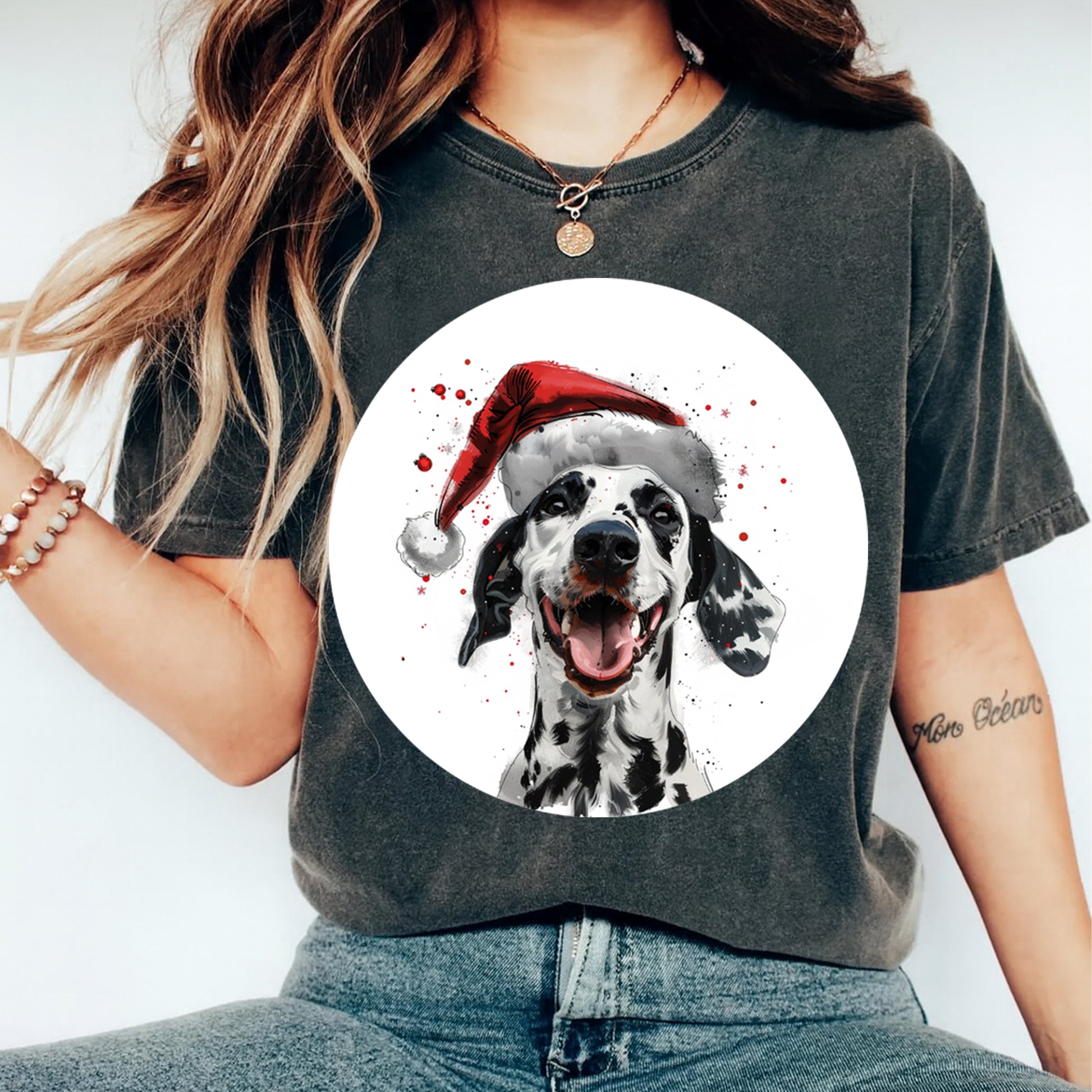 This ready to press Christmas DTF transfer features a cheerful Dalmatian wearing a classic red Santa hat, surrounded by soft winter splatter accents for a festive holiday look. It brings warm seasonal energy and pet-lover charm, perfect for Christmas events, cozy winter outfits, or small-business apparel.