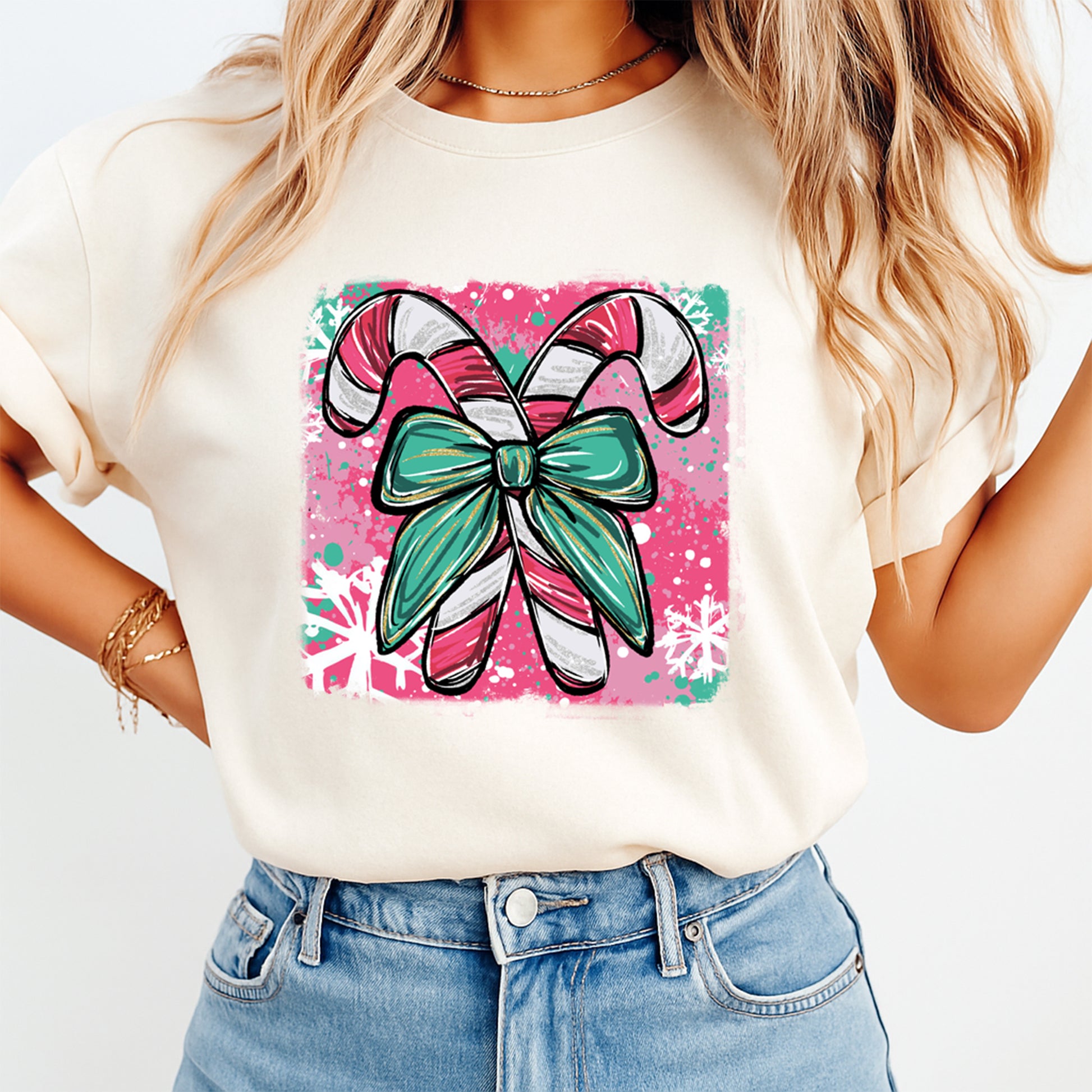 This ready to press Christmas DTF transfer features a pair of candy canes tied together with a large teal bow on a pink splatter background with snowflakes. A bright and festive print that adds a playful pop of color — perfect for holiday apparel, boutique Christmas shirts, and cheerful seasonal crafting projects.