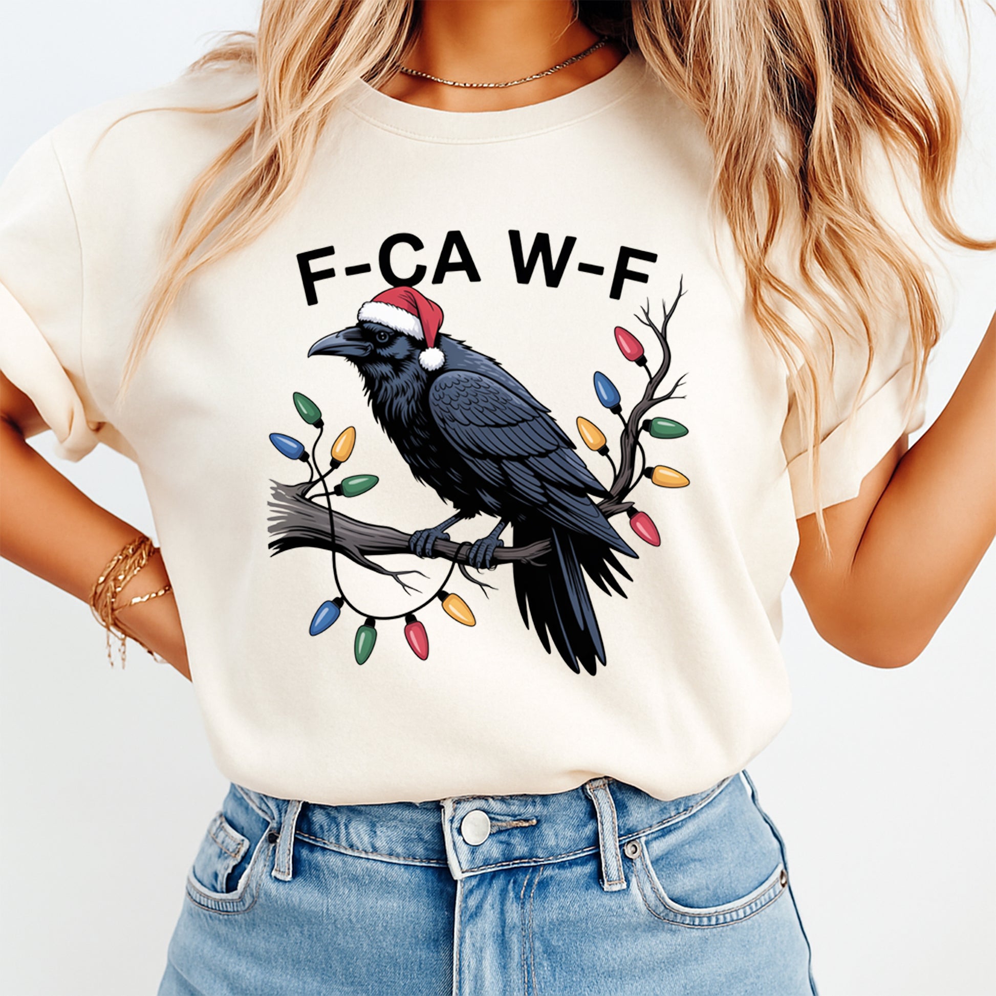This ready to press Christmas DTF transfer features a black crow perched on a branch wrapped in colorful Christmas lights, wearing a Santa hat, and surrounded by the playful phrase “F-CAW-F.” The mix of humor and dark gothic style makes this a fun twist on traditional holiday art — perfect for those who love sarcastic or alternative Christmas vibes. Great for DIY shirts and small business seasonal apparel drops with attitude.