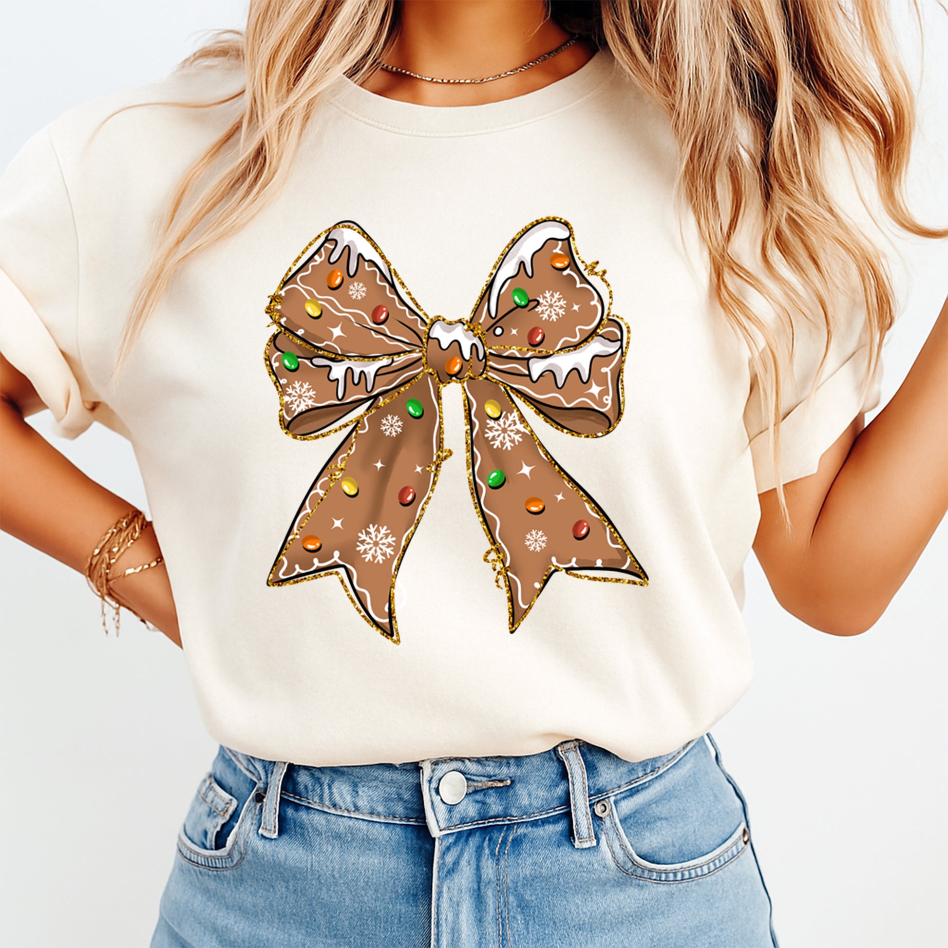This ready to press Christmas DTF transfer features a fun gingerbread-style bow decorated with white icing drips, colorful candy lights, and delicate snowflake details. A sweet and playful take on holiday cheer, perfect for festive Christmas tees, cozy seasonal apparel, or boutique winter collections.