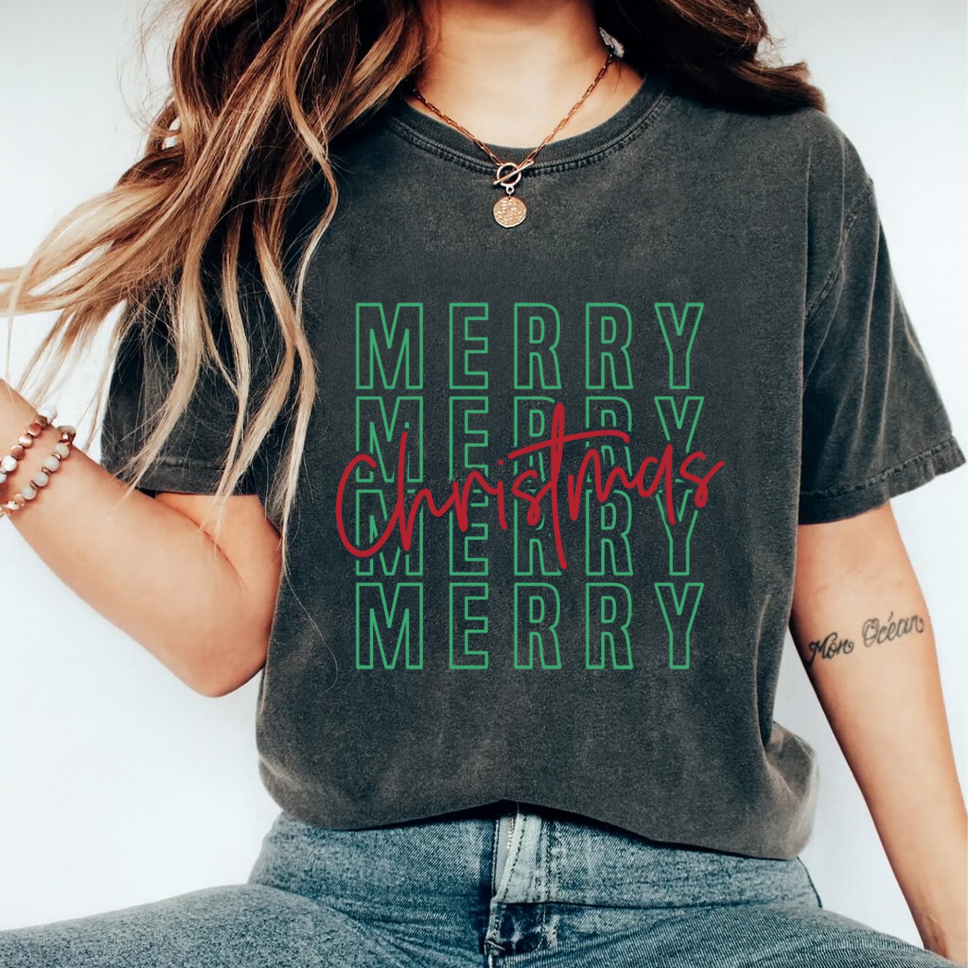 This ready to press Christmas DTF transfer features a trendy red and green layered typography design with the phrase “Merry Merry Merry Christmas.” Perfect for minimal, modern holiday shirts that keep the festive spirit simple yet stylish. Great for matching family outfits, Christmas markets, or cozy seasonal wear.