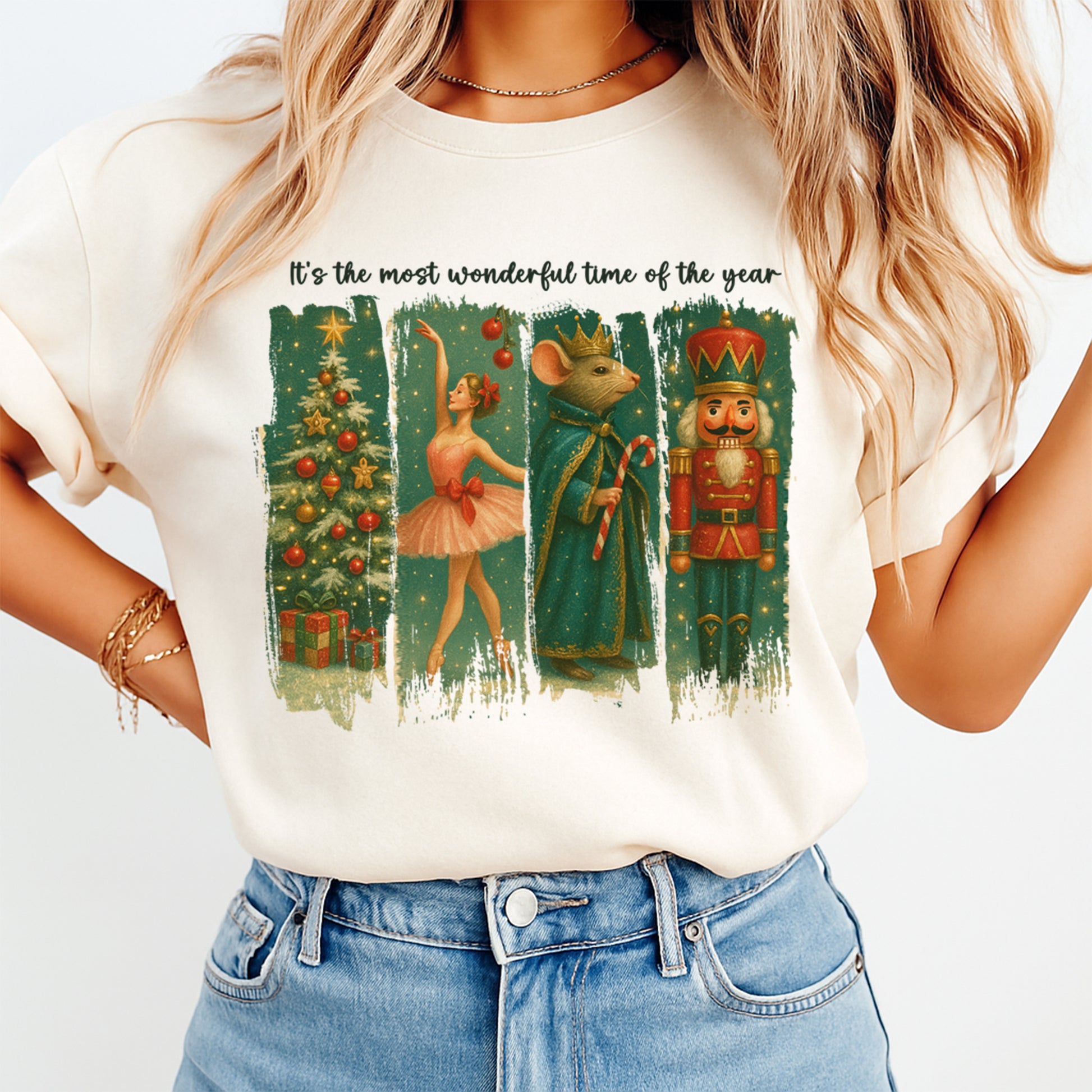 This ready to press Christmas DTF transfer. The graphic features vintage panel art with a Christmas tree, a ballerina, a regal mouse holding a candy cane, and a nutcracker, with golden stars and a nostalgic green palette. Text on the artwork reads: “It’s the most wonderful time of the year.” Ideal for holiday events, family photos, markets, and festive small-business drops—perfect for cultural celebration apparel and DIY shirts with a cozy retro vibe.