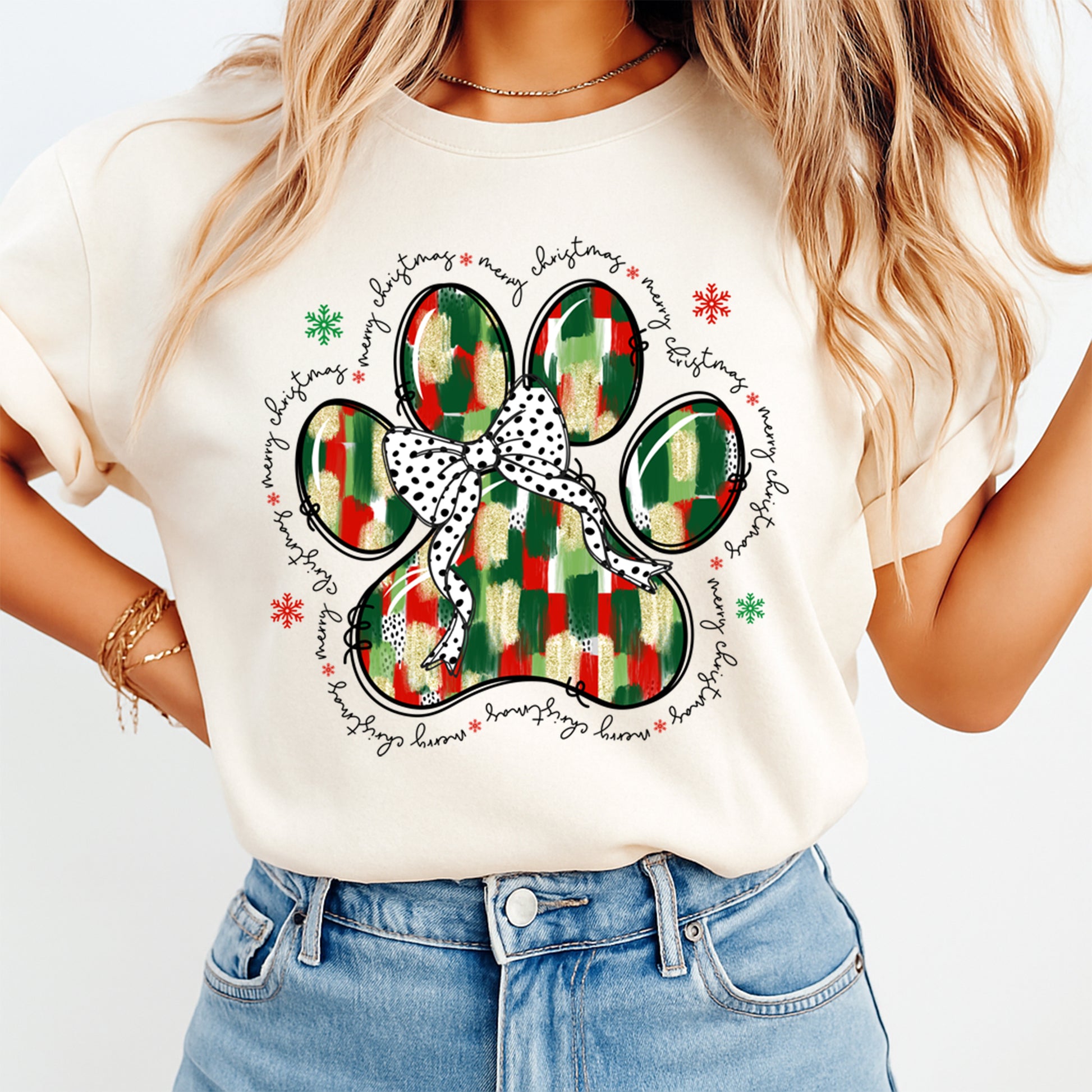 This ready to press Christmas DTF transfer features a festive red, green, and gold paw print wrapped with a black and white polka dot bow, surrounded by the handwritten phrase “merry christmas.” Perfect for pet lovers and holiday apparel makers, this design adds a cozy and playful holiday touch to your DIY shirts.