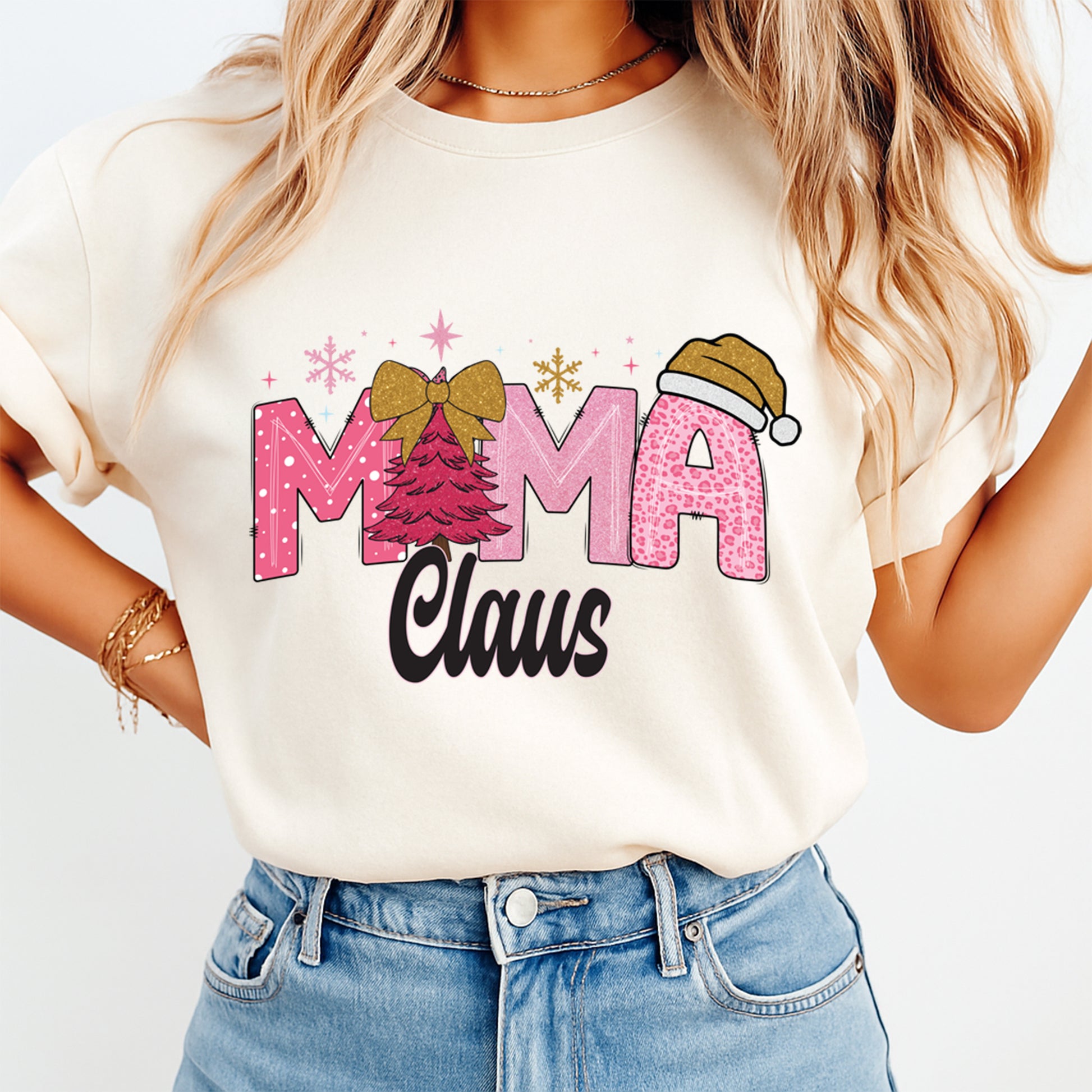 Christmas DTF Transfer – Pink MAMA Claus with Gold Bow and Tree Ready to Press Iron On Heat Transfer for DIY Shirts 11864