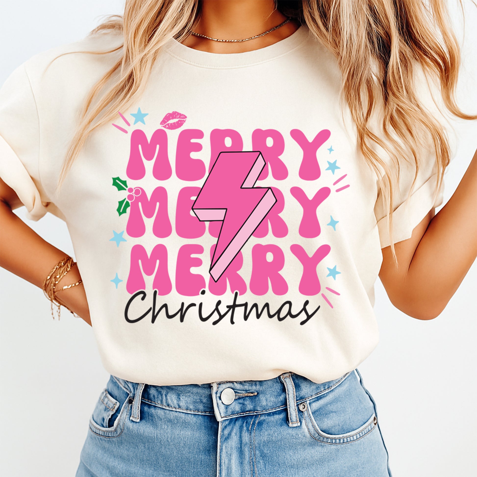Christmas DTF Transfer – Pink Merry Merry Merry Christmas with Lightning Bolt Ready to Press Iron On Heat Transfer for DIY Shirts 11870