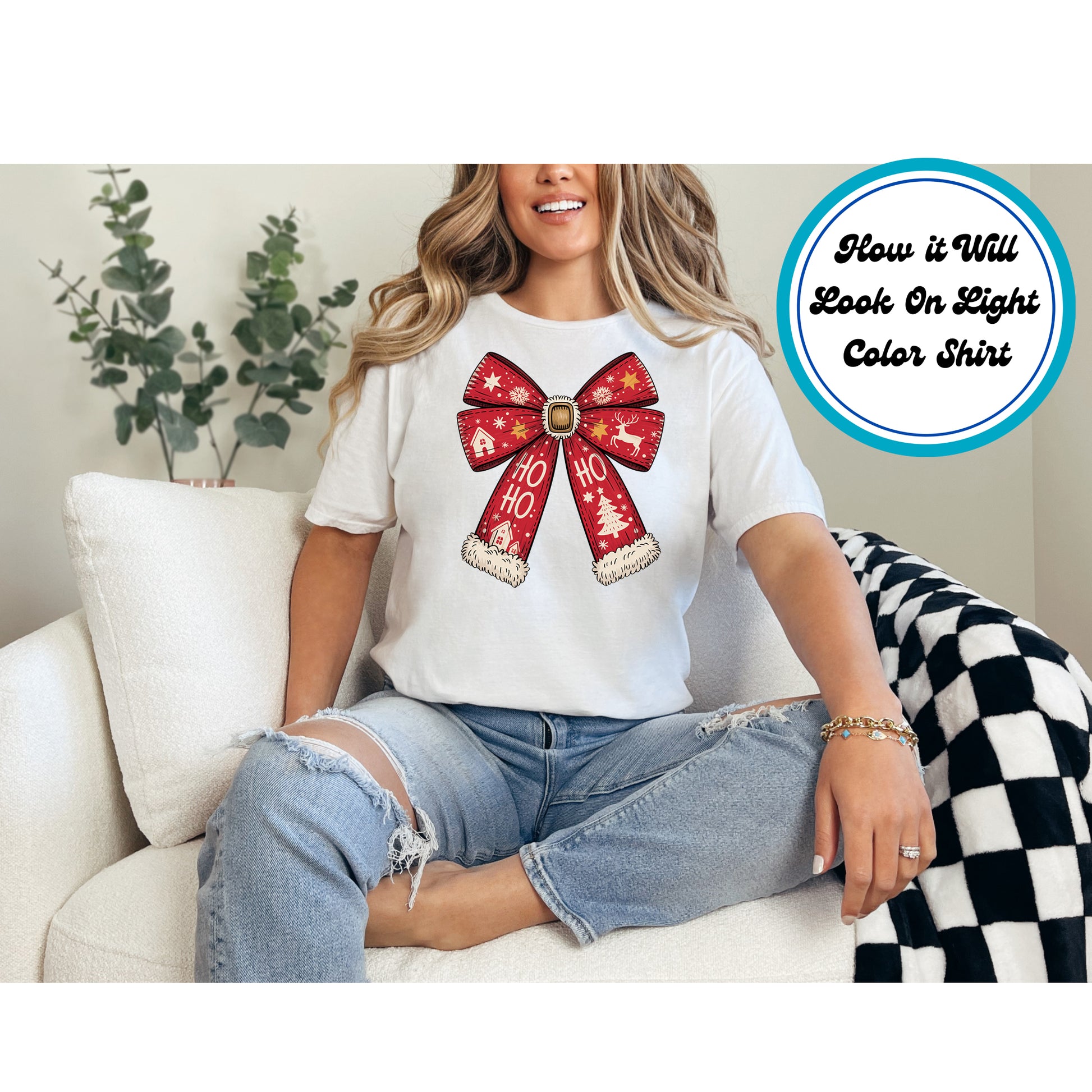 Ideal for Christmas parties, seasonal outfits, boutique collections, and custom small business apparel. This festive bow design is a must-have for DIY shirt makers wanting a cheerful, holiday-ready look.