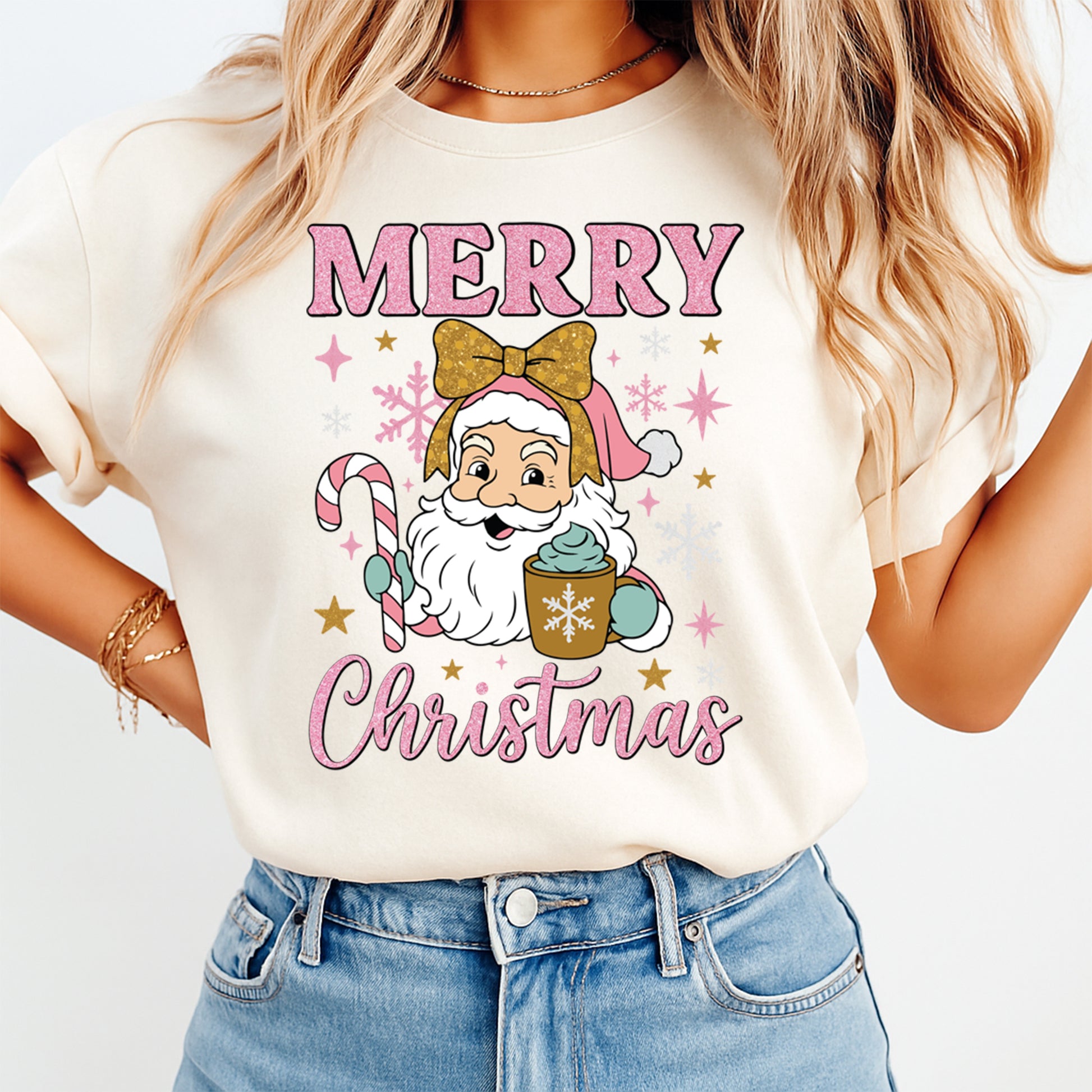 This ready to press Christmas DTF transfer features a cheerful Santa wearing a pink hat and sparkling gold bow, holding a candy cane and cup of cocoa topped with whipped cream. Surrounded by snowflakes and stars, this cozy and festive design brings warm holiday vibes to any shirt or sweatshirt. Perfect for boutique apparel, Christmas market sellers, or family holiday outfits.