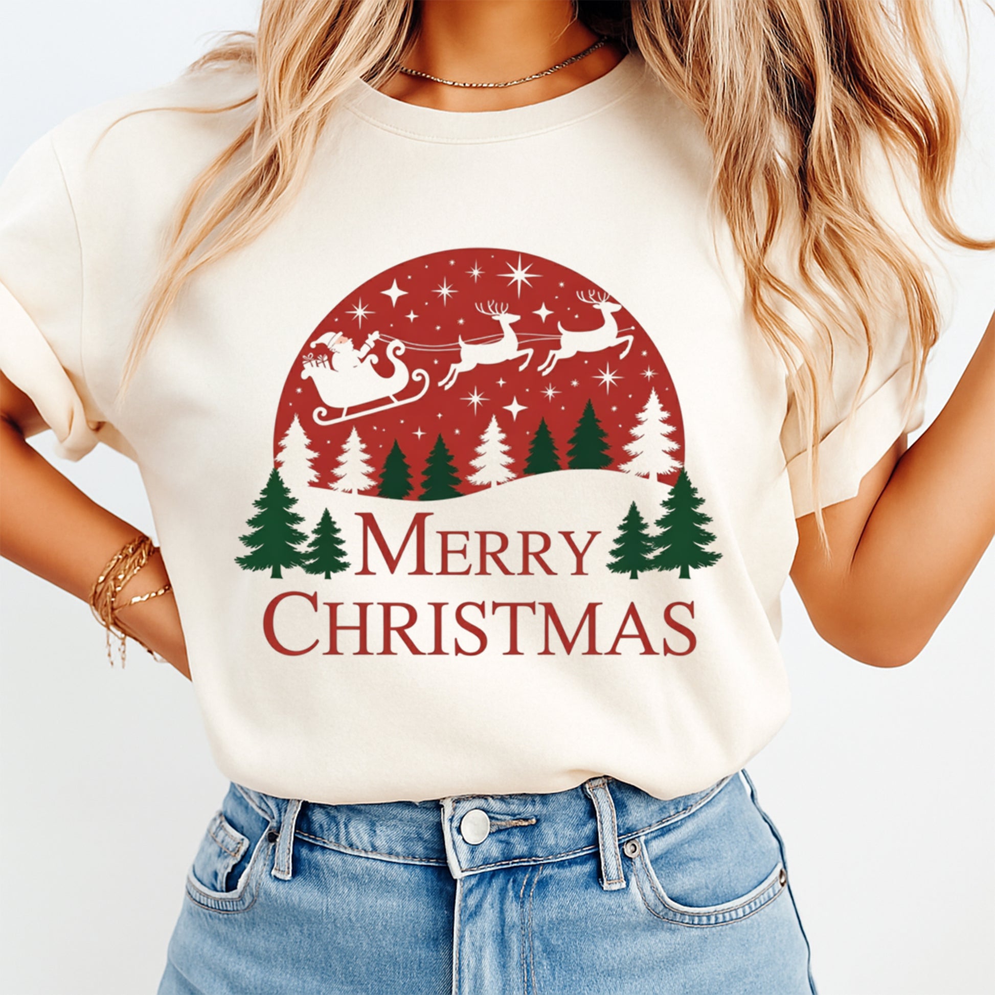This ready to press Christmas DTF transfer features a classic red and green holiday scene with Santa’s sleigh and reindeer flying over a forest of pine trees under a starry sky. The “Merry Christmas” message below completes this timeless festive look — perfect for family holiday shirts, seasonal events, and boutique winter collections.