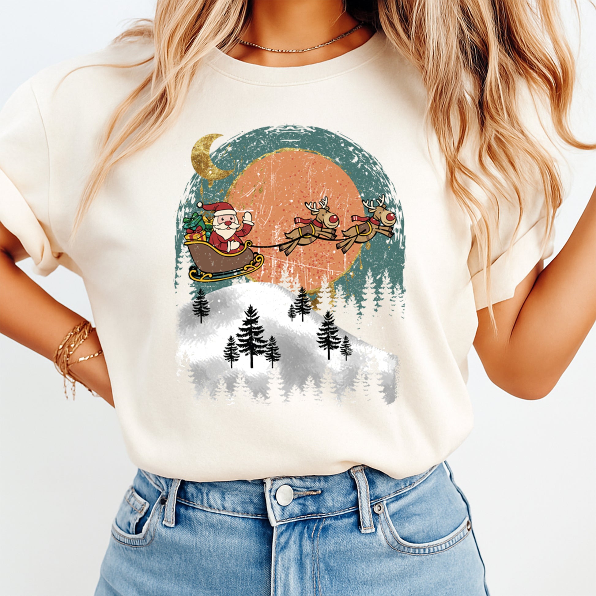 This ready to press Christmas DTF transfer features Santa in his sleigh flying over snow-covered pine trees, led by reindeer under a golden moon and rustic sunset background. The vintage, textured style adds warmth and charm to any holiday shirt or sweatshirt, making it perfect for cozy seasonal apparel and festive DIY projects.