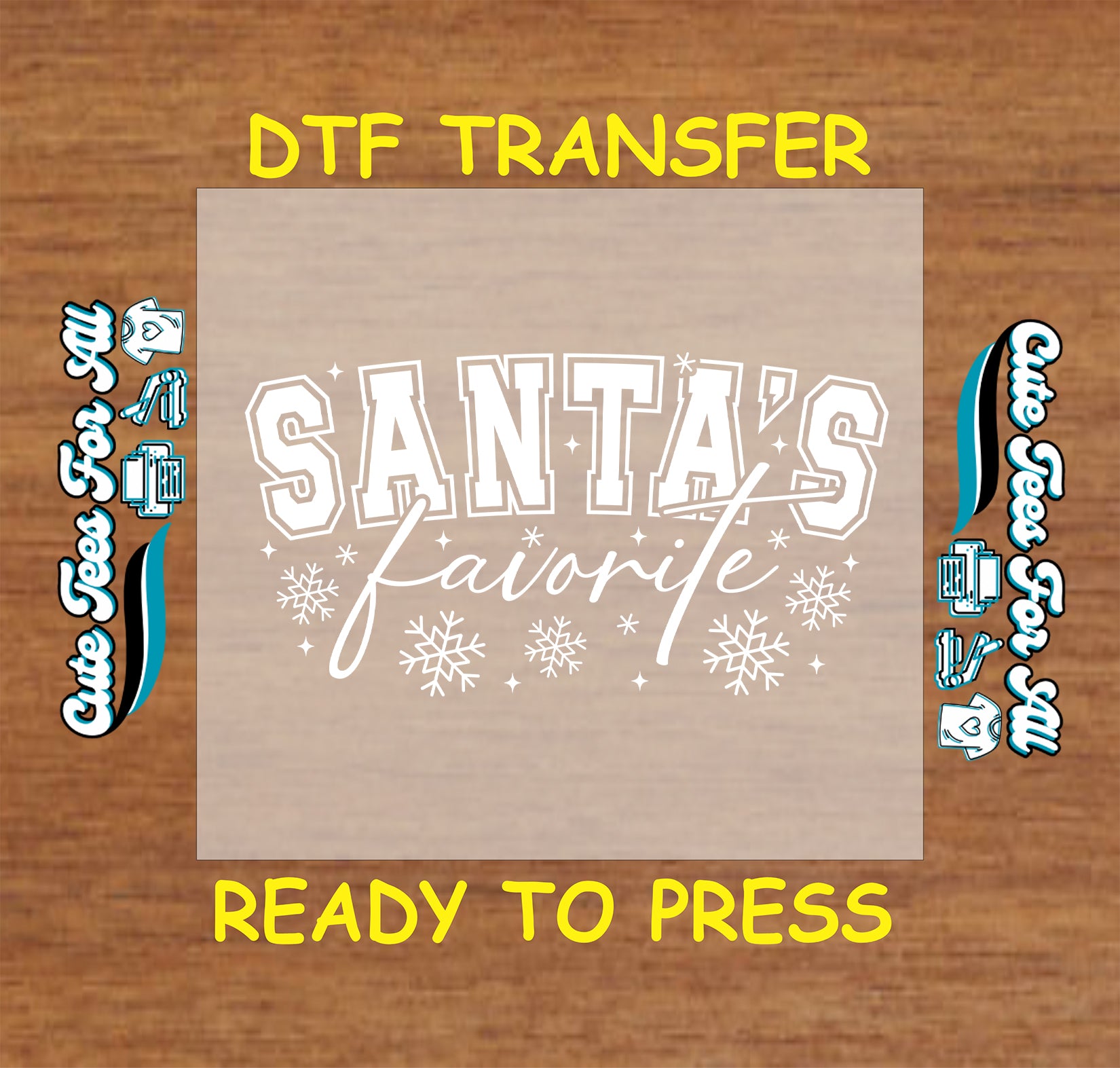 This ready to press Christmas DTF transfer features the festive phrase “Santa’s Favorite” in bold varsity-style lettering with elegant script and detailed snowflakes. The clean white design gives it a timeless winter look—perfect for creating cozy matching holiday shirts, festive loungewear, or small-business apparel drops. Ideal for Christmas markets, family events, and personalized DIY shirts for the holiday season.