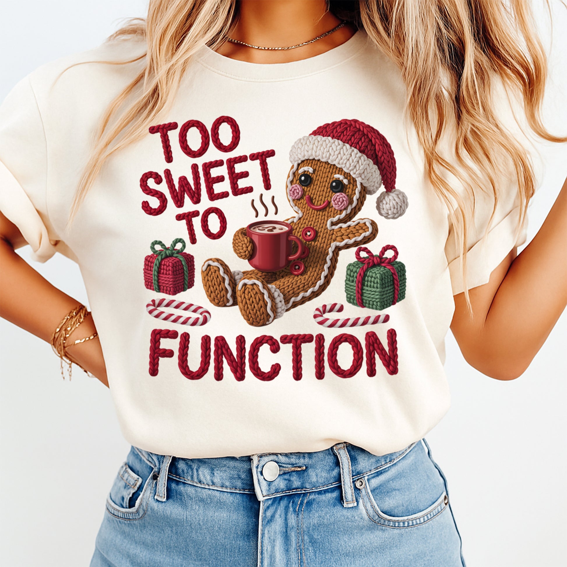 This ready to press Christmas DTF transfer features a yarn-style gingerbread character lounging with a mug of cocoa, candy canes, and wrapped gifts. The playful phrase “Too Sweet to Function” adds a funny holiday twist, paired with the cozy knitted aesthetic perfect for seasonal apparel.