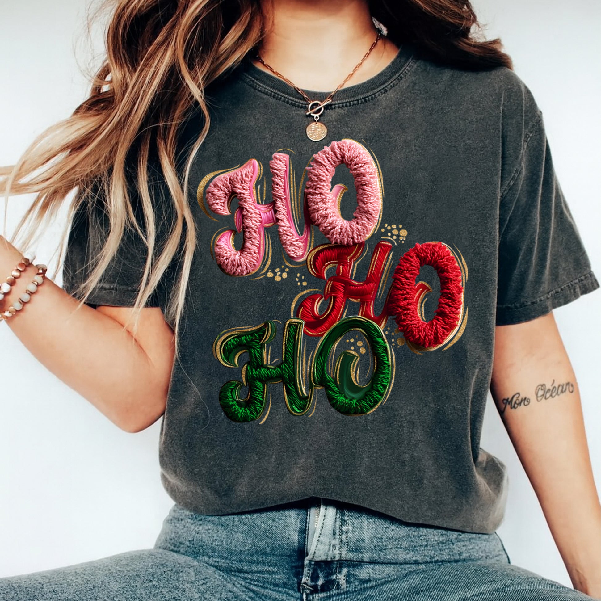 This ready to press Christmas DTF transfer features three festive “Ho Ho Ho” letters in cozy yarn-crochet textures, blending pink, red, and green stitched styles with gold accents for a handcrafted holiday look. The soft fiber-art aesthetic gives this design a warm Christmas feel that works beautifully for boutique apparel, seasonal drops, and festive December collections.