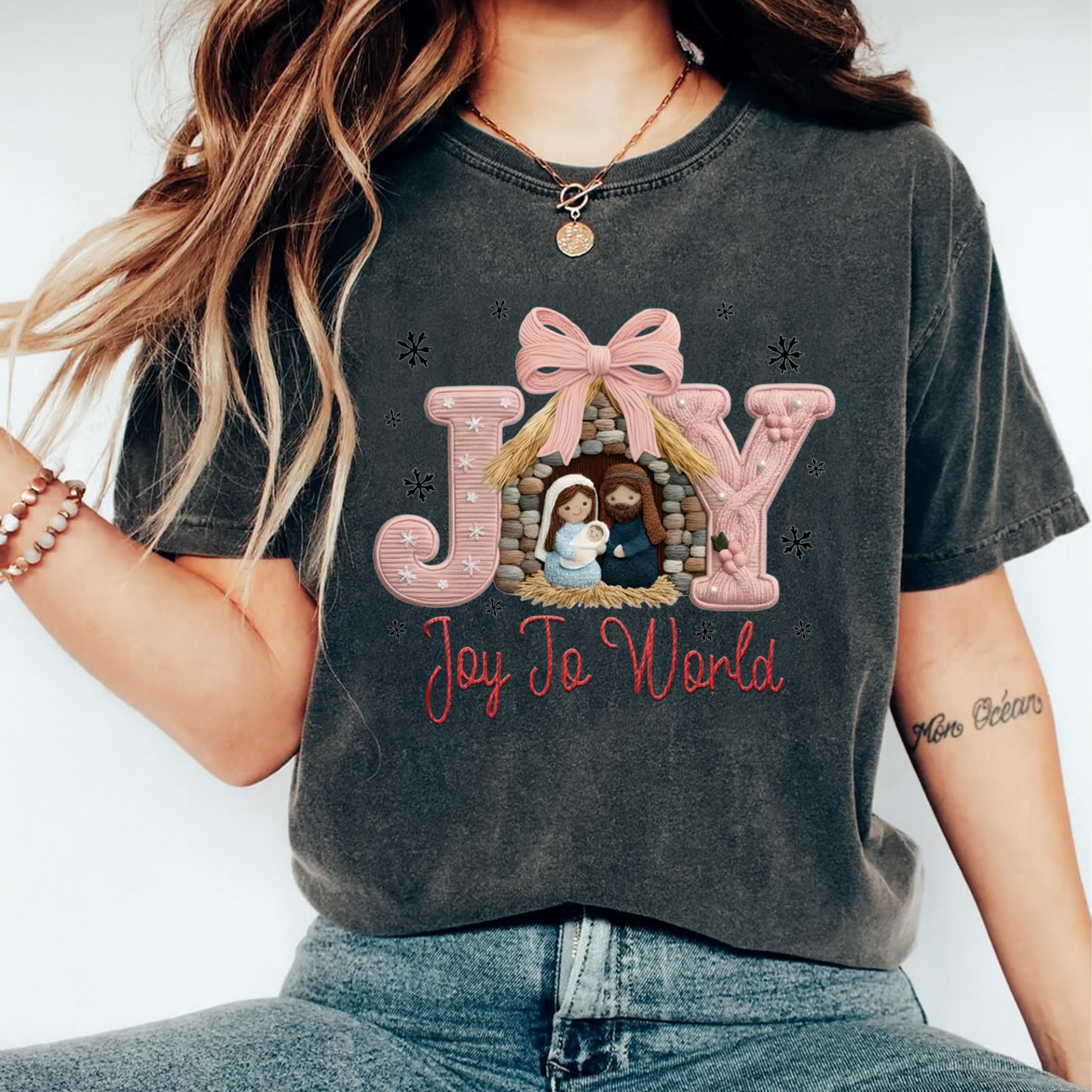 This ready to press Christmas DTF transfer features the word “Joy” in pink yarn-style letters, with a nativity scene inside the “O” and the phrase “Joy To World” displayed below. The soft crochet-inspired textures create a warm, handcrafted feel that appeals to religious Christmas buyers, faith-based boutiques, church events, and family holiday apparel.