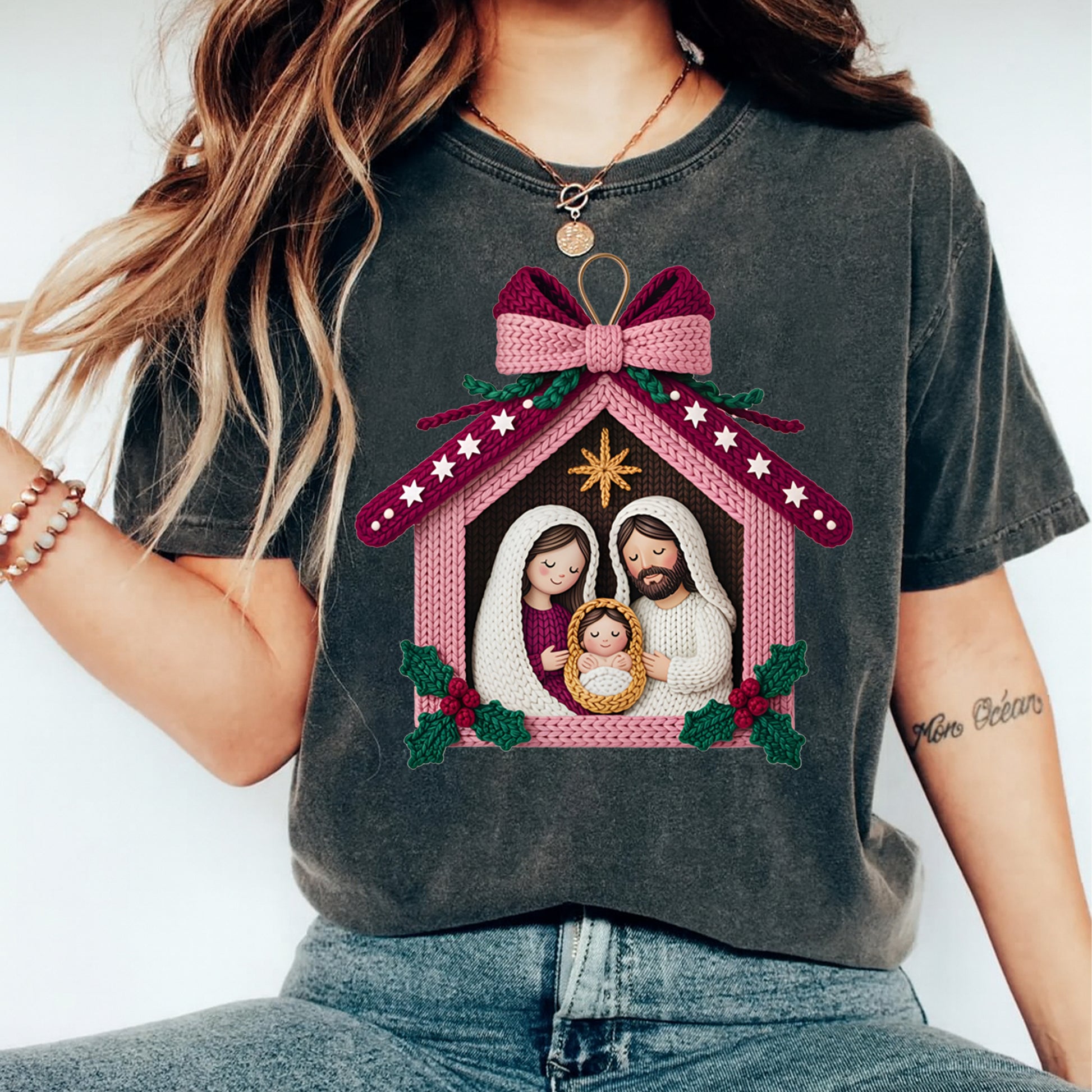 This ready to press Christmas DTF transfer features a peaceful nativity yarn-crochet scene with Mary, Joseph, and baby Jesus inside a stitched stable framed with knitted holly, stars, and a large yarn bow. The artwork blends handcrafted crochet textures with warm Christmas tones, perfect for spiritual holiday apparel, church events, and family gatherings.