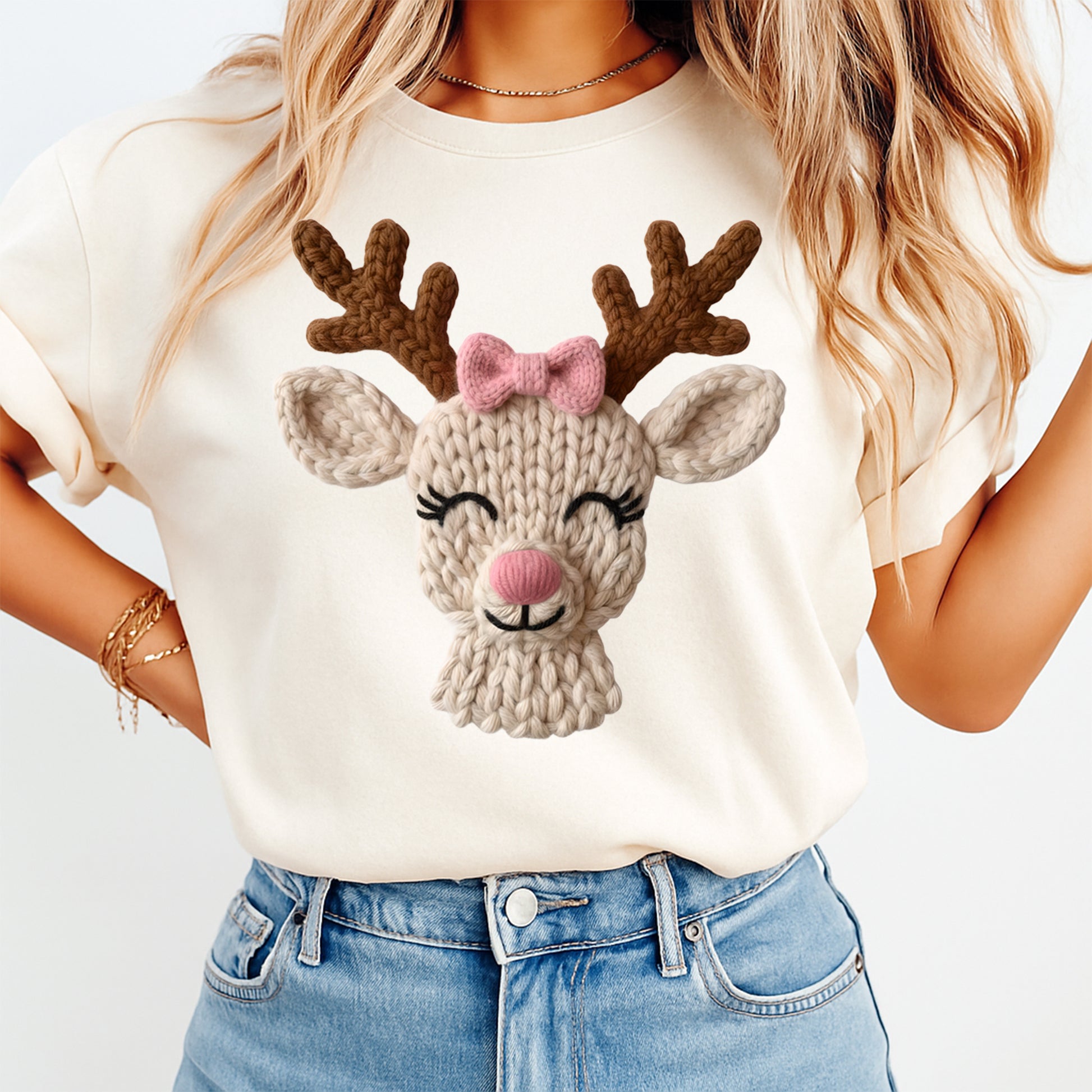 Christmas Reindeer Pink Bow Yarn Style DTF Transfer – Ready to Press Iron On Heat Transfer for DIY Christmas Shirts 12262