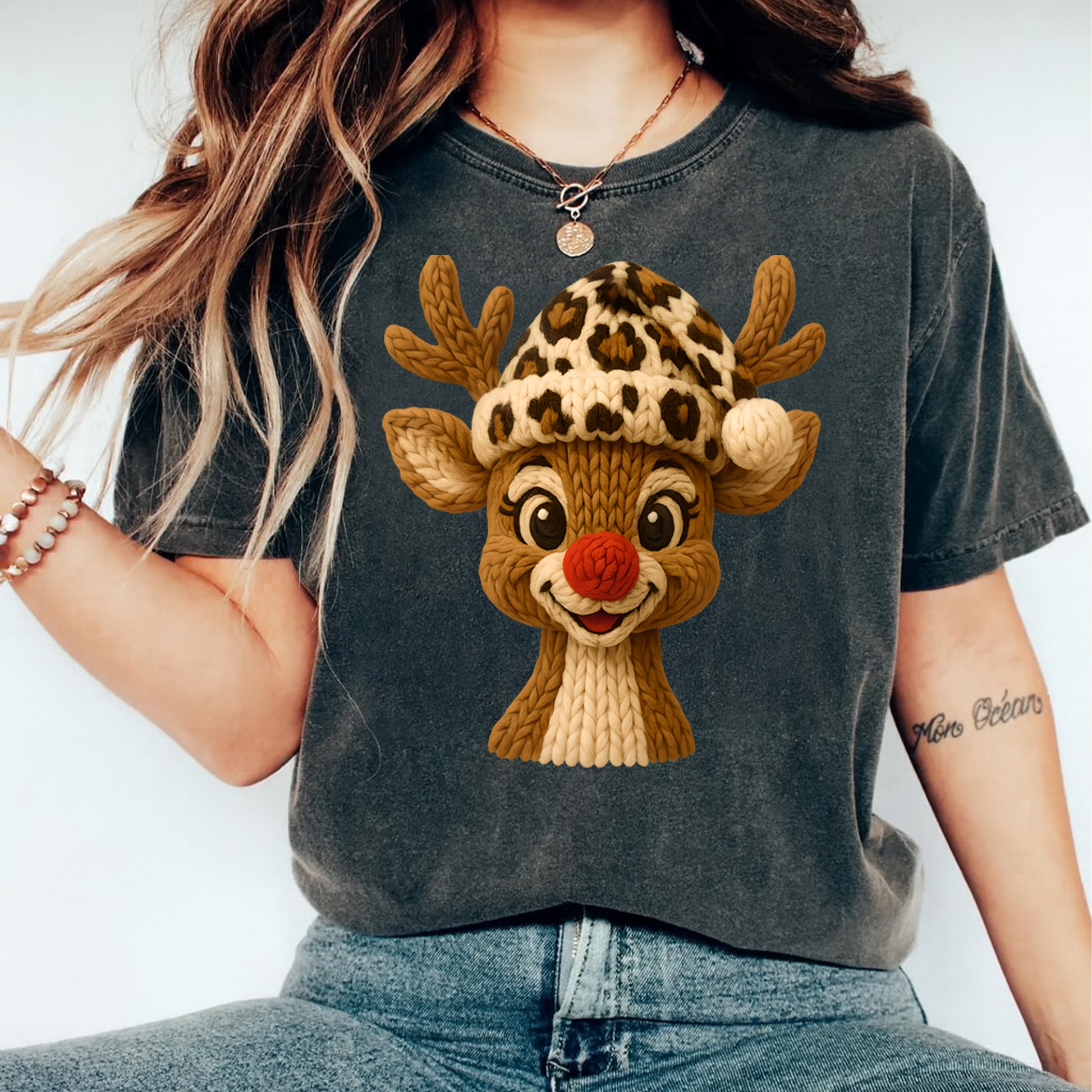 This ready to press Christmas DTF transfer showcases a yarn-knit style reindeer with a playful red nose and a cozy leopard winter hat, giving it a warm handmade holiday aesthetic. The textured stitches and soft brown tones make it perfect for festive apparel and seasonal crafting.