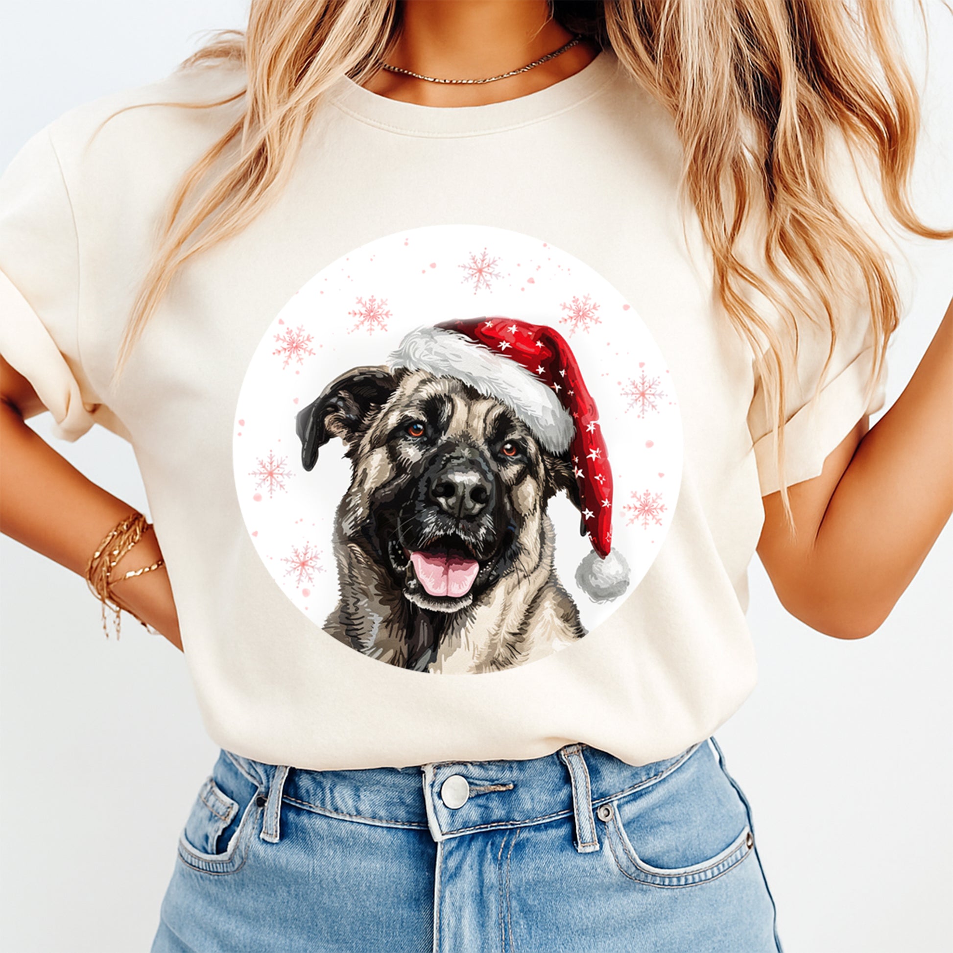 This ready to press Christmas DTF transfer features a shepherd-mix style dog wearing a Santa hat inside a round snowflake portrait, creating a warm and festive seasonal look. The expressive face, multi-tone fur, and wintery background make it perfect for pet lovers, Christmas events, winter pop-ups, and seasonal DIY apparel collections for small businesses.