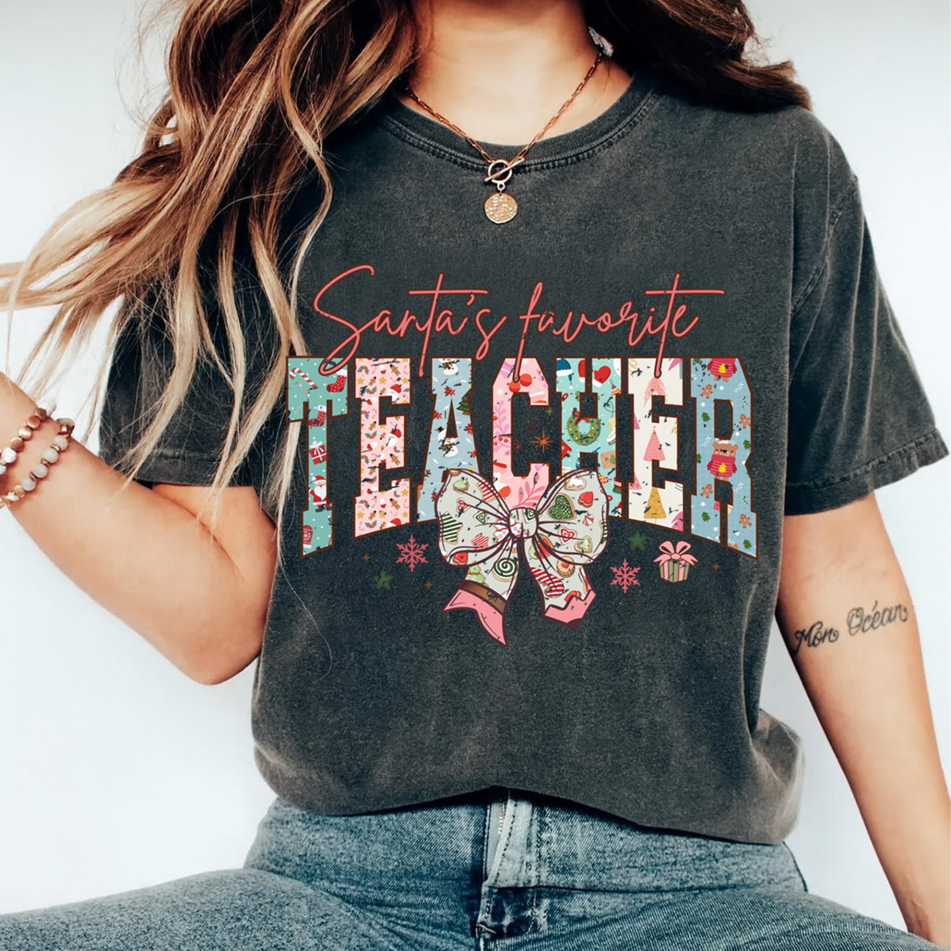 This ready to press Christmas DTF transfer features the phrase “Santa’s favorite teacher” in colorful holiday-patterned letters accented with ornaments, stars, and a festive bow. It’s the perfect way for teachers to celebrate the Christmas season while adding a touch of personality and cheer to their apparel.