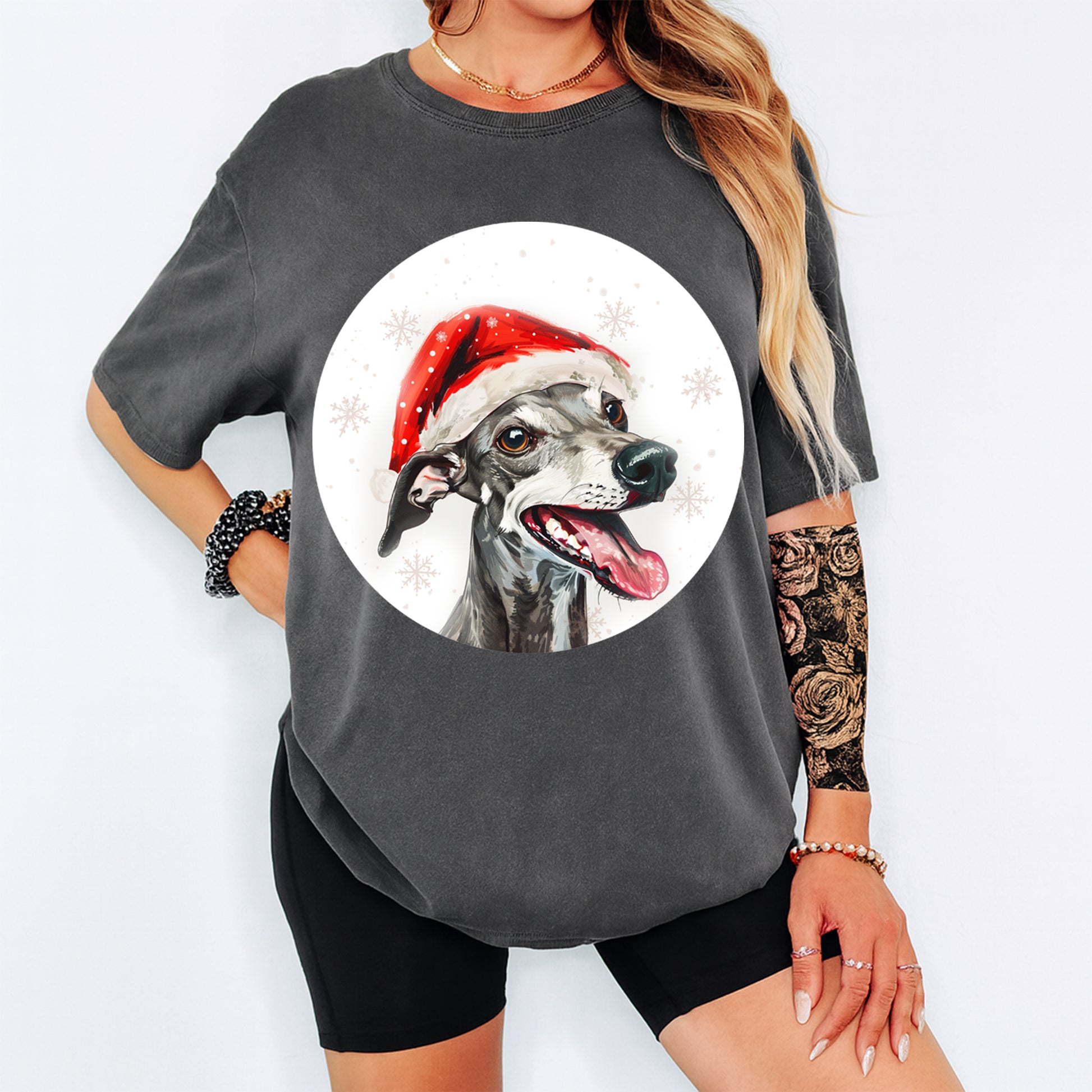 This ready to press Christmas DTF transfer features a joyful gray whippet-style pup wearing a bright red Santa hat surrounded by subtle snowflakes and winter splashes, creating a playful and festive holiday look. Perfect for DIY shirts, winter craft fairs, pet lover Christmas apparel, holiday events, and seasonal small business collections made to stand out with cheerful dog artwork.