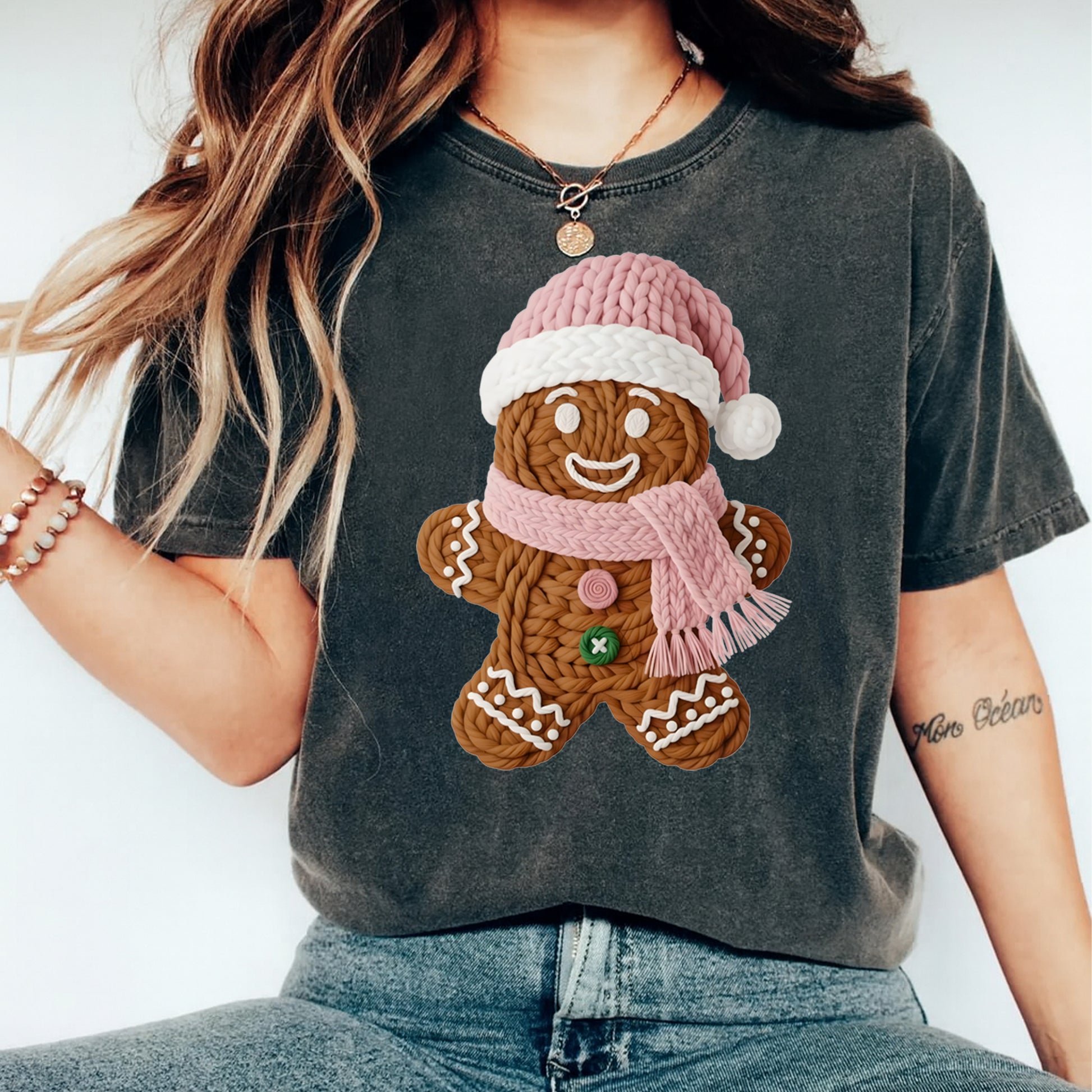 This ready to press Christmas DTF transfer features a cozy yarn-textured gingerbread character wearing a pink knit Santa hat and matching pink scarf, complete with stitched frosting details and festive buttons. The handcrafted yarn aesthetic gives this design a warm, whimsical Christmas feel perfect for seasonal apparel and holiday DIY shirts.
