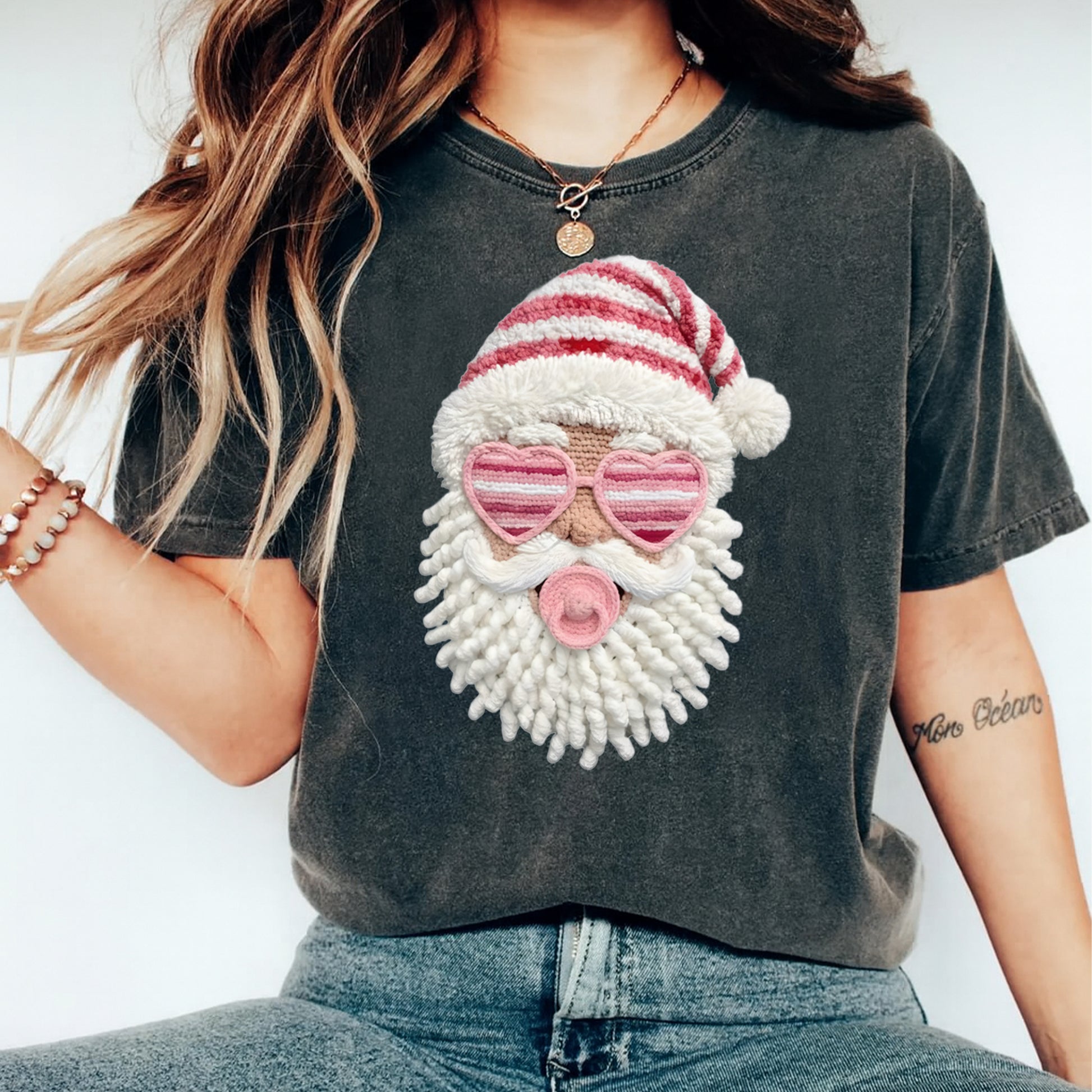 This ready to press Christmas DTF transfer features a handmade yarn-style Santa with a fluffy textured beard, striped knit hat, pink heart-shaped glasses, and a matching candy-inspired nose detail. The playful yarn aesthetic gives this design a fun, whimsical Christmas feel perfect for festive apparel, seasonal events, and trendy DIY holiday shirts.
