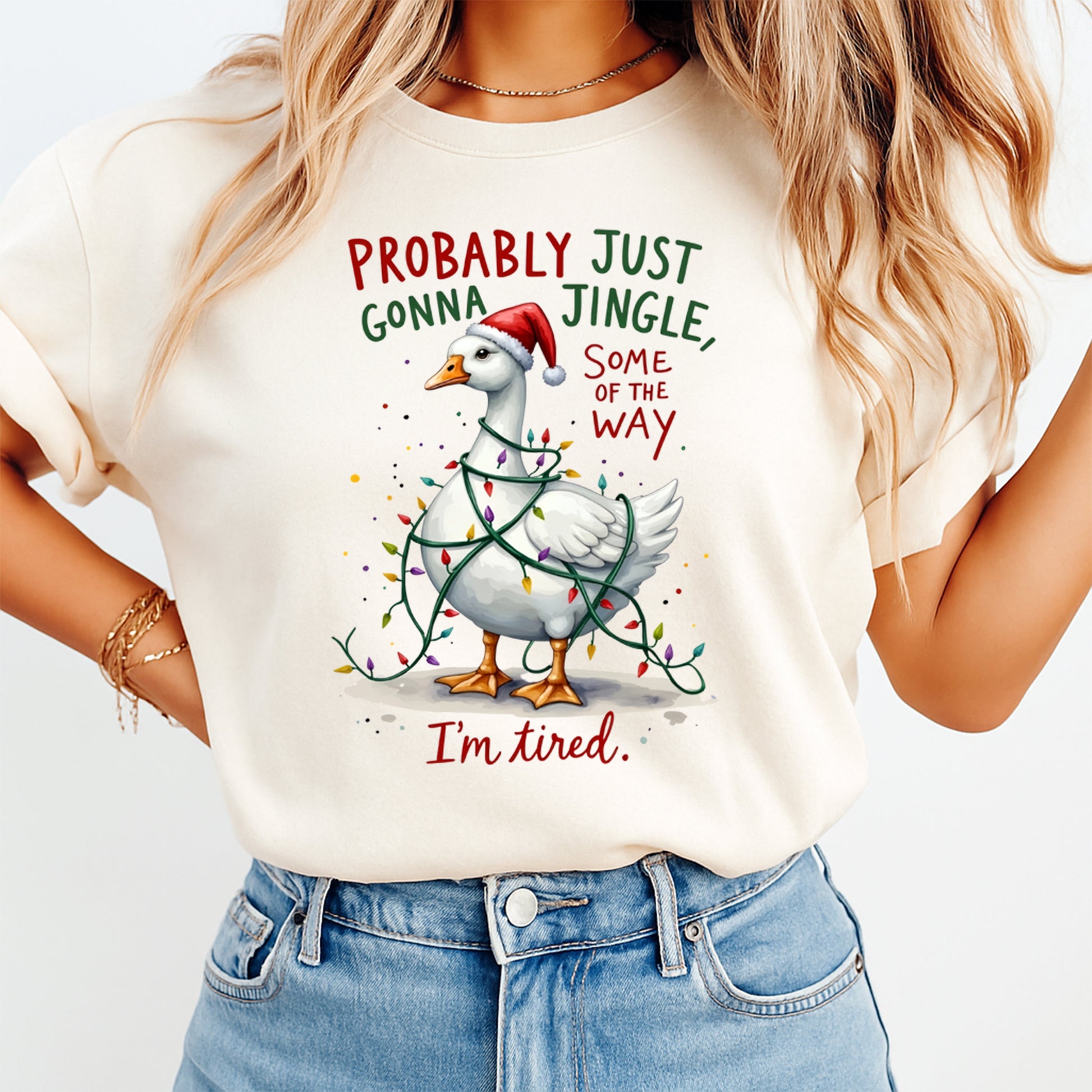 This ready to press Christmas DTF transfer features a hilarious goose wrapped in colorful holiday lights, wearing a Santa hat, with the funny phrase “Probably just gonna jingle, some of the way. I’m tired.” Perfect for adding a touch of humor to your Christmas apparel lineup, this festive goose brings holiday cheer with a sarcastic twist.