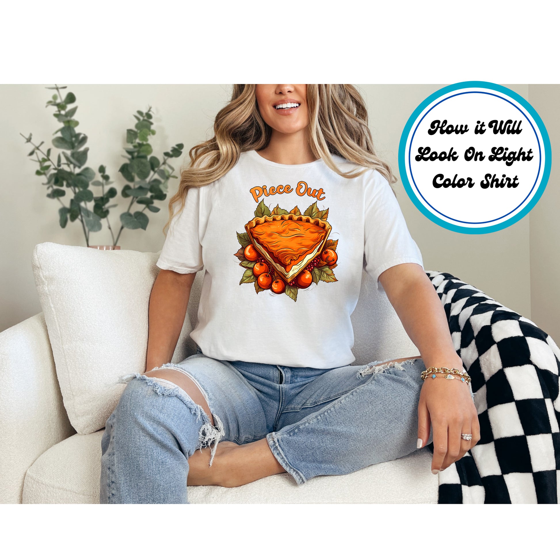 This ready to press Thanksgiving DTF transfer features the playful phrase “Piece Out” above a delicious pumpkin pie slice surrounded by autumn leaves and seasonal fruit. Perfect for pie lovers, holiday humor fans, and anyone wanting to add a fun twist to their Thanksgiving or Friendsgiving outfit. The warm fall tones make it ideal for cozy seasonal apparel.
