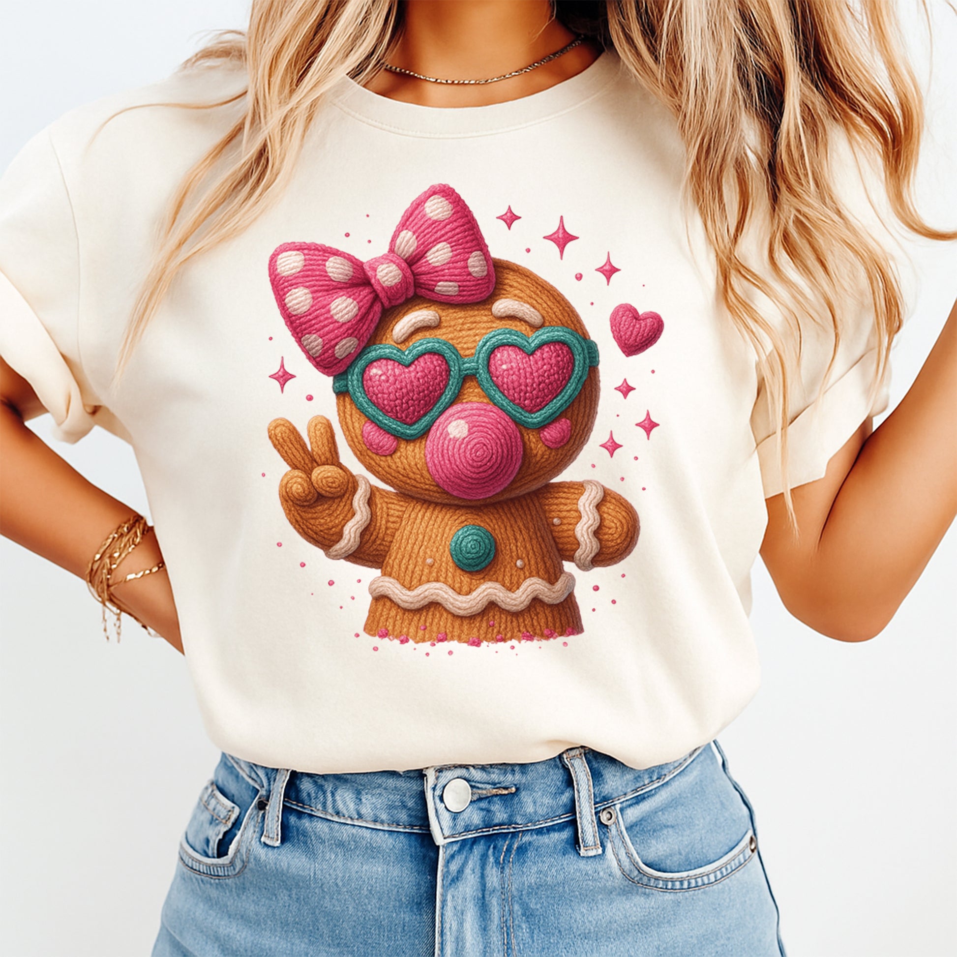 This ready to press Christmas DTF transfer features a crochet-style gingerbread girl wearing teal heart sunglasses, a big pink polka-dot bow, and blowing a bubblegum bubble while flashing a peace sign. Pink stitched hearts and sparkles surround her for an extra fun boutique look. The yarn-textured gingerbread style and girly holiday vibe make this design perfect for kids’ Christmas shirts, girly holiday apparel, teacher shirts, and playful DIY Christmas shirts for festive events and market season.