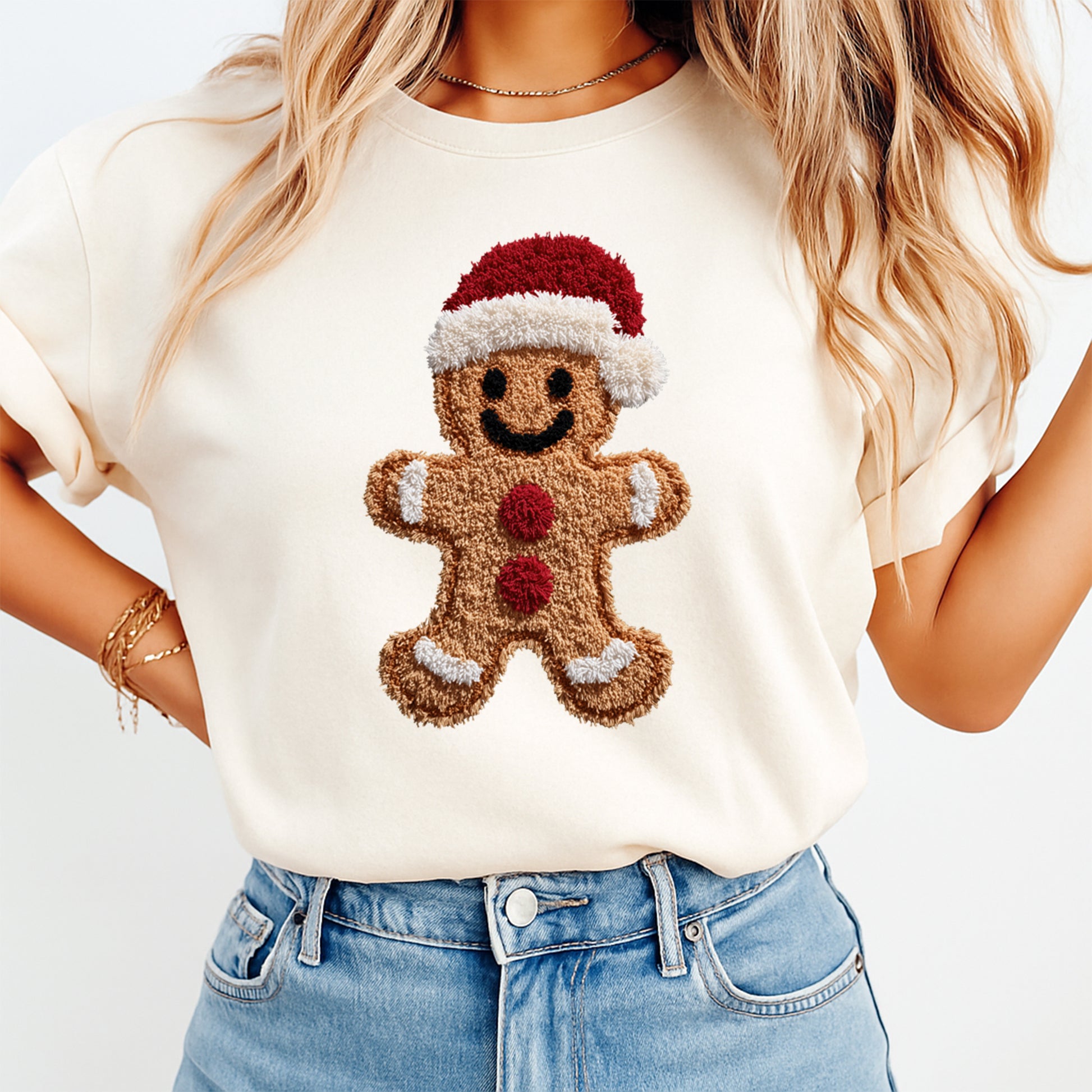 This ready to press Christmas DTF transfer features a crochet-textured gingerbread cookie character wearing a fluffy Santa hat, stitched smile, and red yarn buttons. The soft fiber-art texture gives it a cozy, handcrafted boutique feel—perfect for kid-friendly Christmas shirts, teacher holiday outfits, market season apparel, and DIY Christmas shirts with a warm classic charm. This design is simple, festive, and ideal for small business holiday collections that need a timeless Christmas favorite.