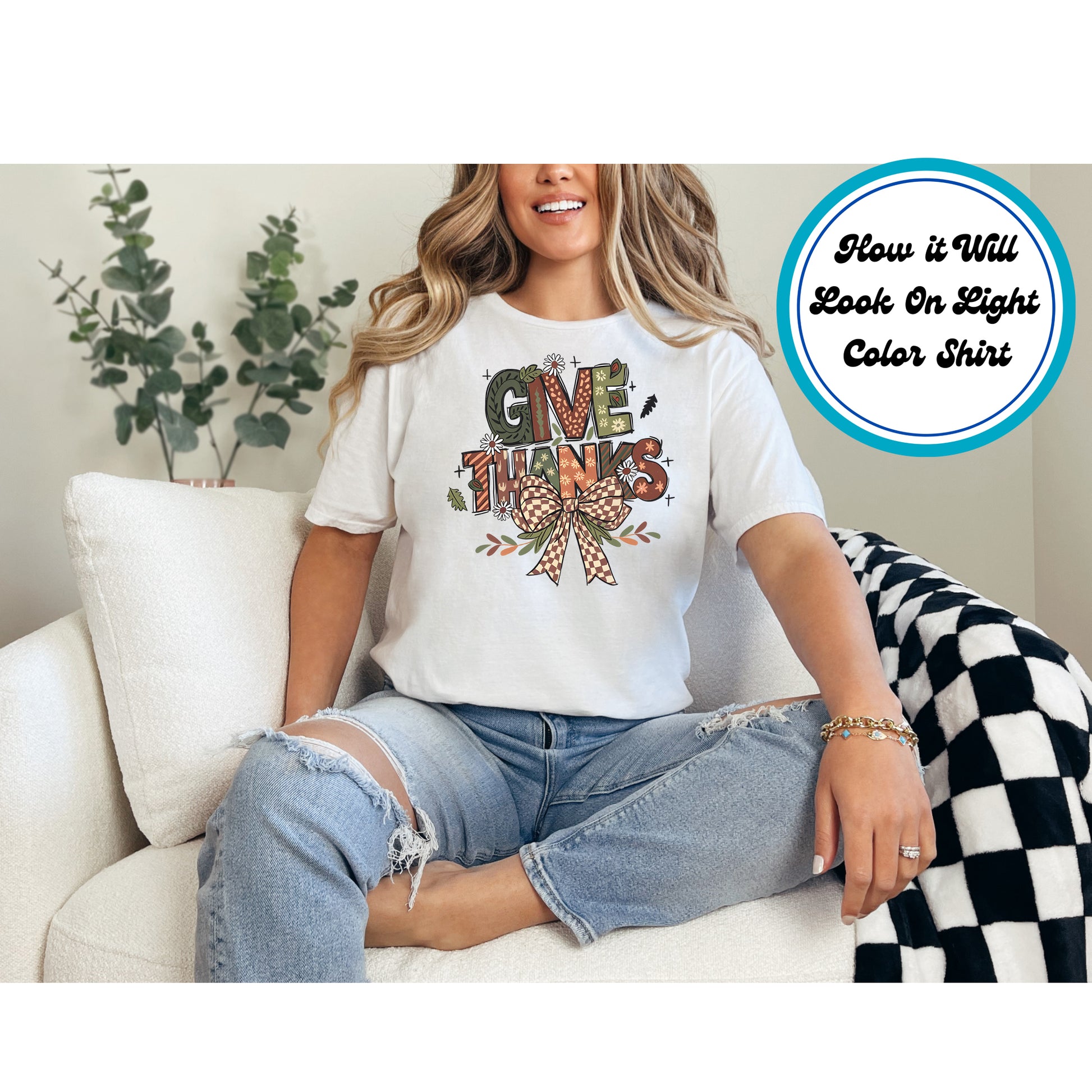 Thanksgiving DTF Transfer – Give Thanks Text with Fall Bow and Flowers Ready to Press Iron On Heat Transfer for DIY Shirts 11286