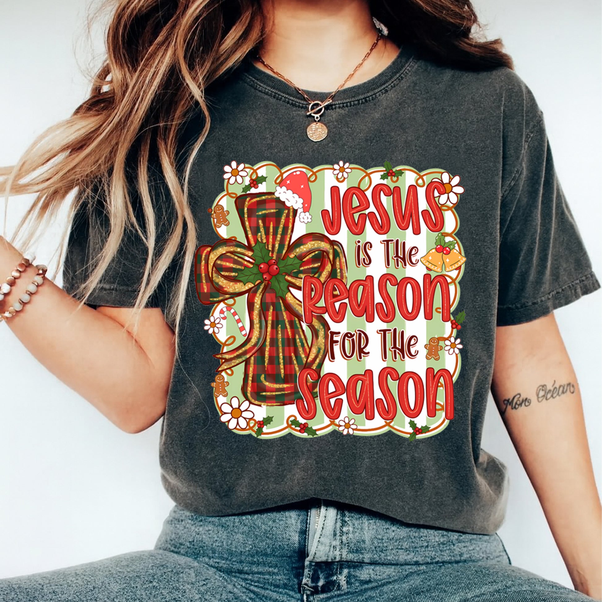 This ready to press Christmas DTF transfer features the uplifting message “Jesus Is the Reason for the Season” beside a festive plaid cross wrapped with a holiday bow, surrounded by gingerbread cookies, holly, and candy canes. A beautiful faith-based Christmas design that celebrates the true meaning of the season, perfect for church events, family gatherings, and Christian apparel collections.