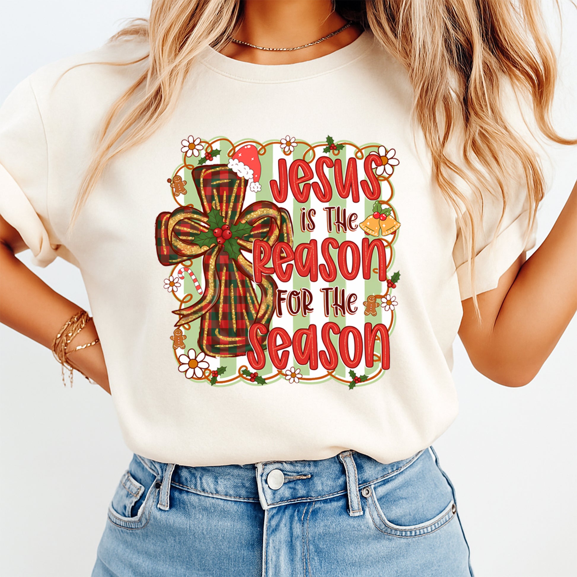 Christmas DTF Transfer – Jesus Is the Reason for the Season Cross with Plaid Bow Ready to Press Iron On Heat Transfer for DIY Shirts 11748