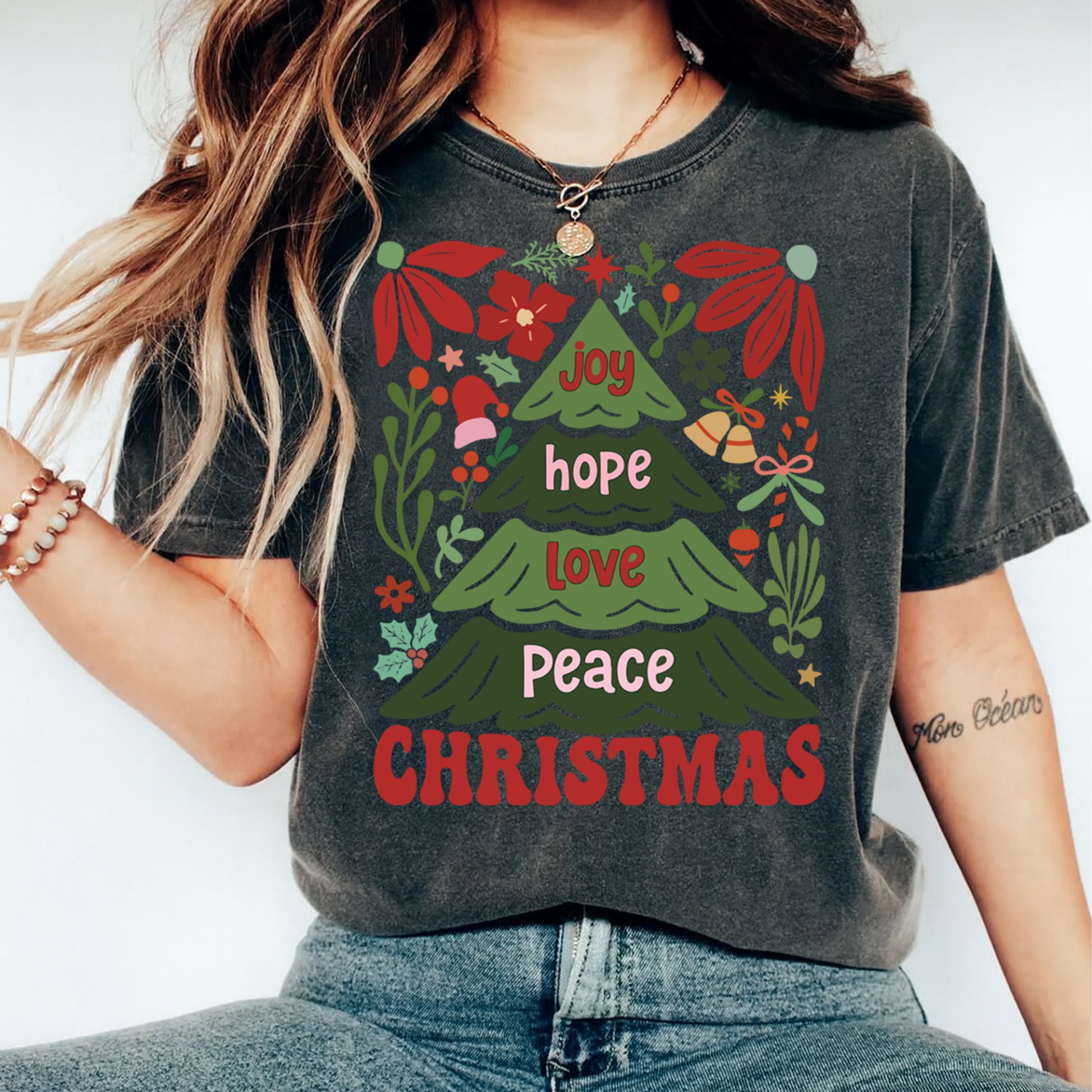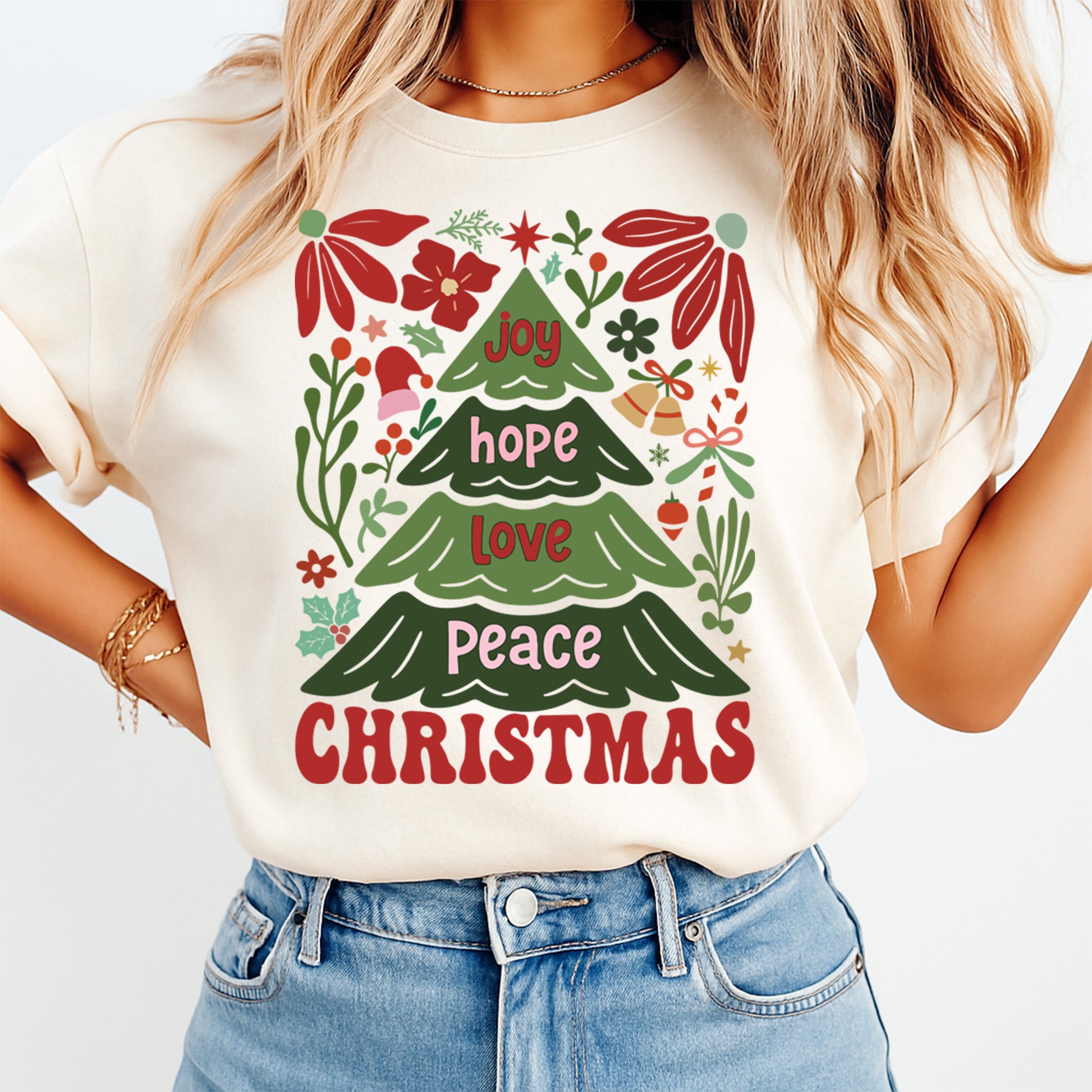 Christmas DTF Transfer – Joy Hope Love Peace Christmas Tree with Holiday Florals Ready to Press Iron On Heat Transfer for DIY Shirts 11758