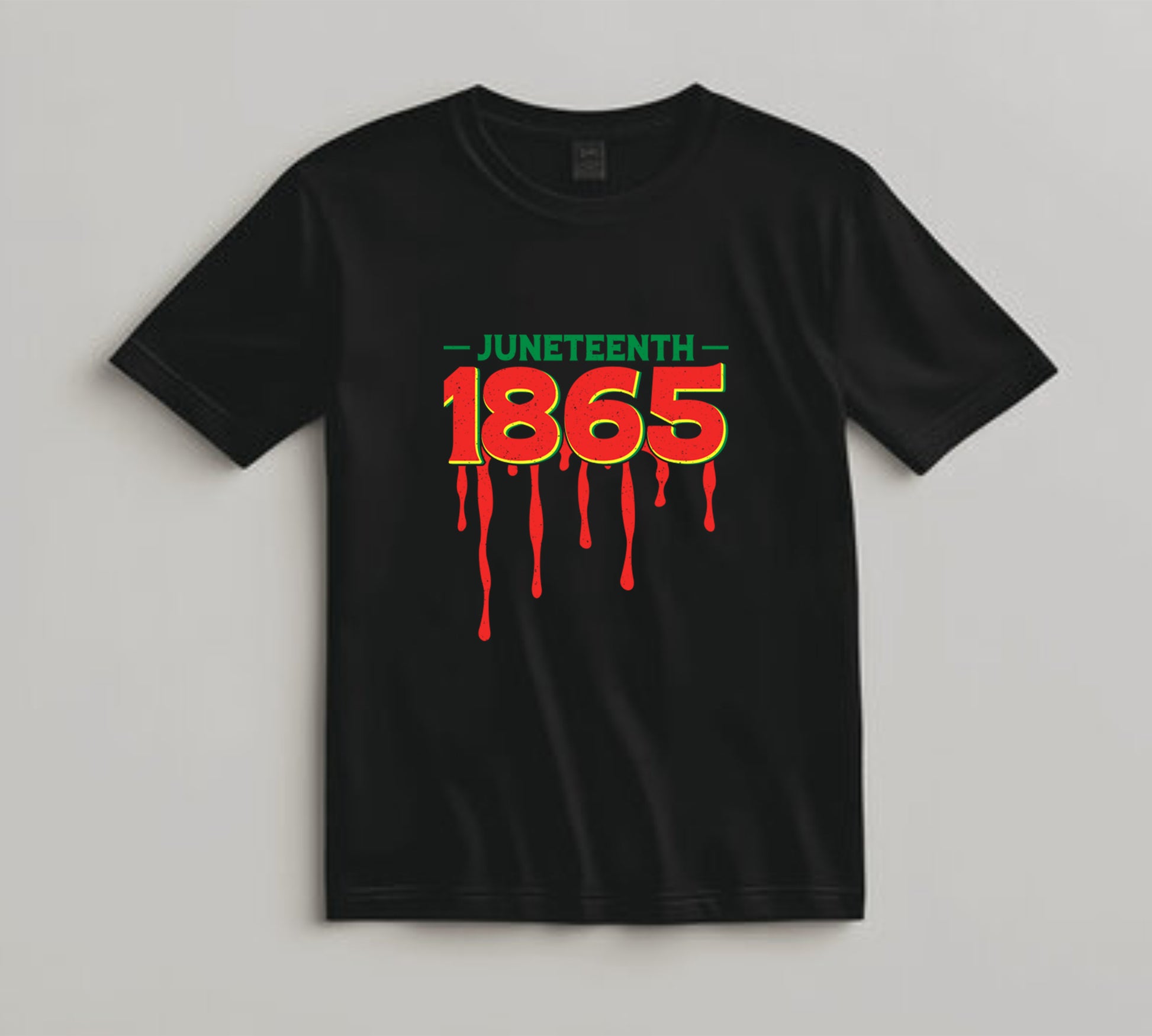 Product Description: This striking ready-to-press DTF transfer features bold “1865” lettering in red with green and yellow accents and a dripping effect, paired with “Juneteenth” above. A dramatic visual for Juneteenth apparel that honors history with impact.