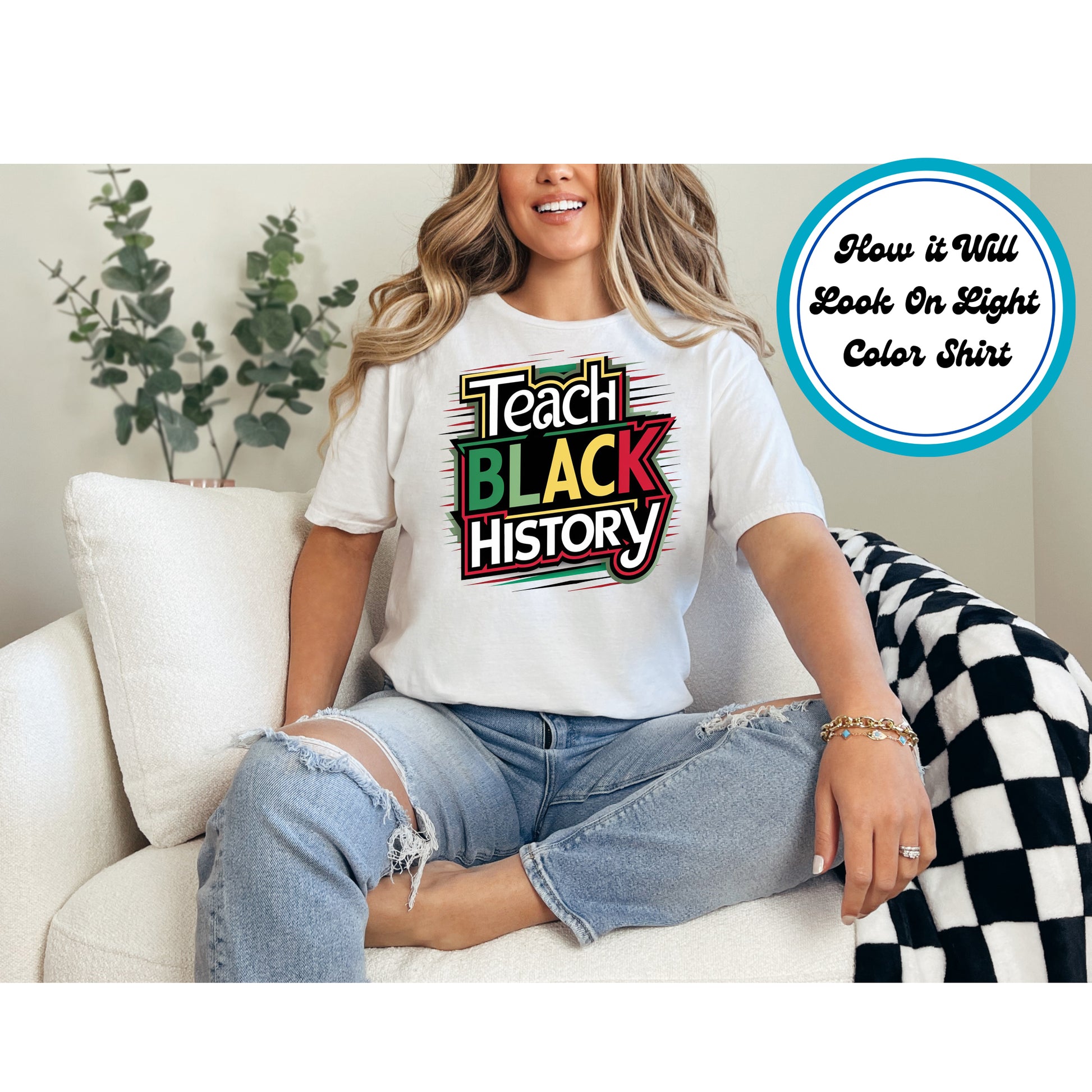 Product Description: This ready-to-press DTF transfer boldly states “Teach Black History” in a striking layout with red, green, yellow, and black colors. Perfect for creating apparel that honors and promotes cultural education.